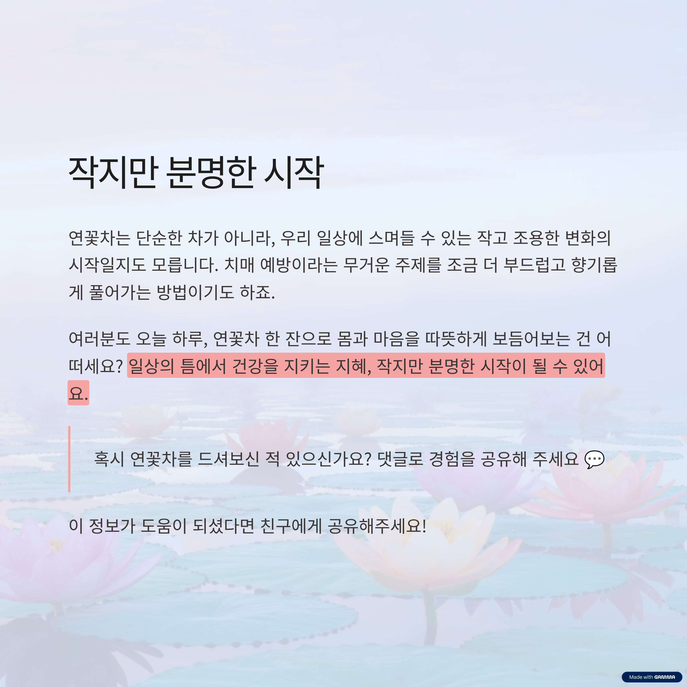 연꽃차는 단순한 차가 아니라, 우리 일상에 스며들 수 있는 작고 조용한 변화의 시작일지도 모릅니다. 치매 예방이라는 무거운 주제를 조금 더 부드럽고 향기롭게 풀어가는 방법이기도 하죠. 여러분도 오늘 하루, 연꽃차 한 잔으로 몸과 마음을 따뜻하게 보듬어보는 건 어떠세요? 일상의 틈에서 건강을 지키는 지혜, 작지만 분명한 시작이 될 수 있어요.