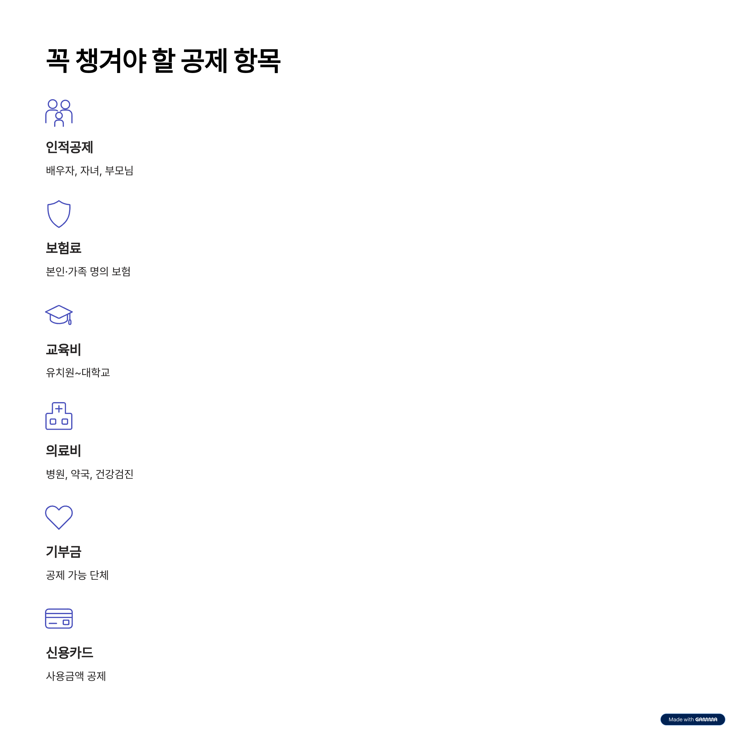 대표적인 공제 항목으로는 다음과 같은 것들이 있어요.