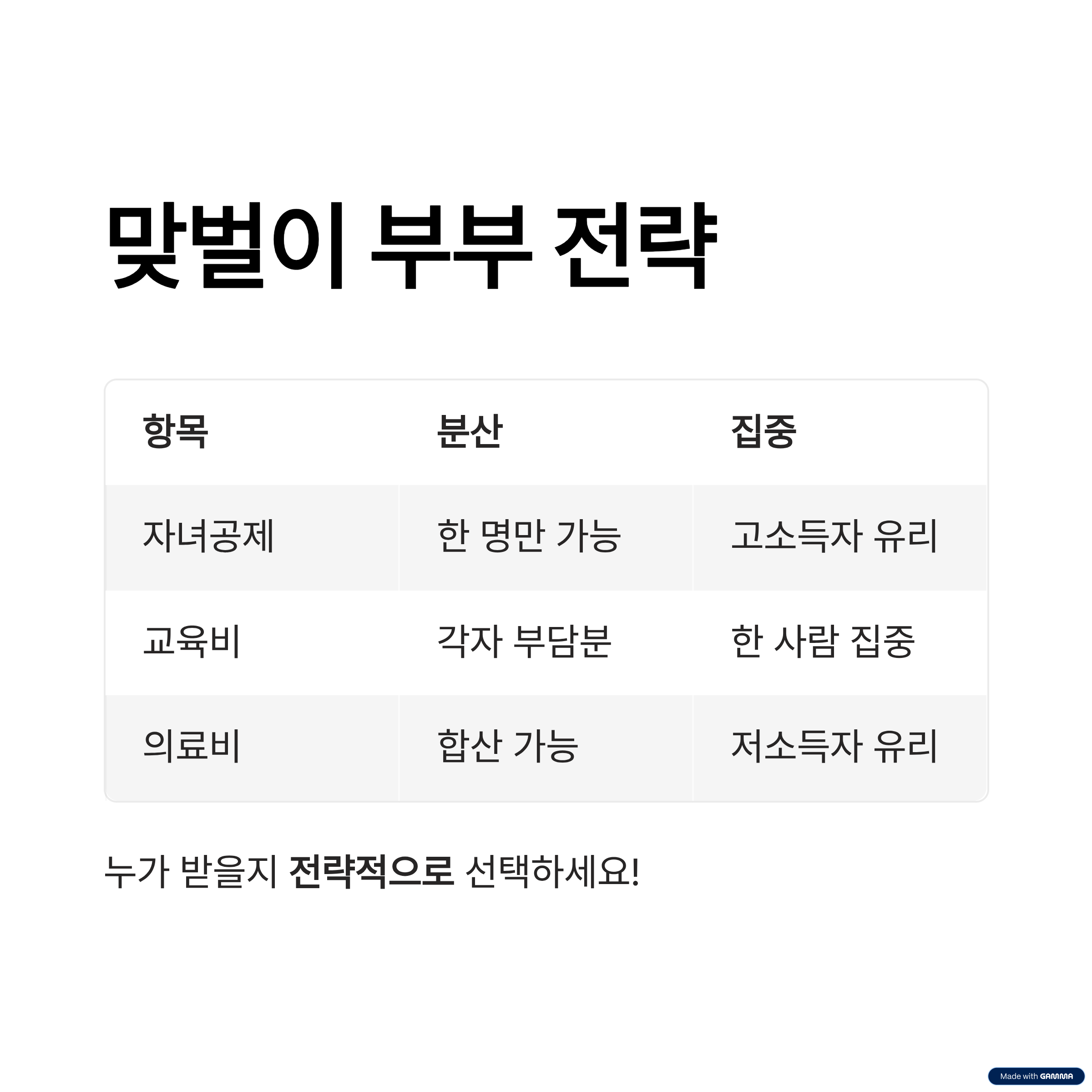 | 자녀공제 | 부부 중 한 명만 가능 | 보통 고소득자에게 유리 |