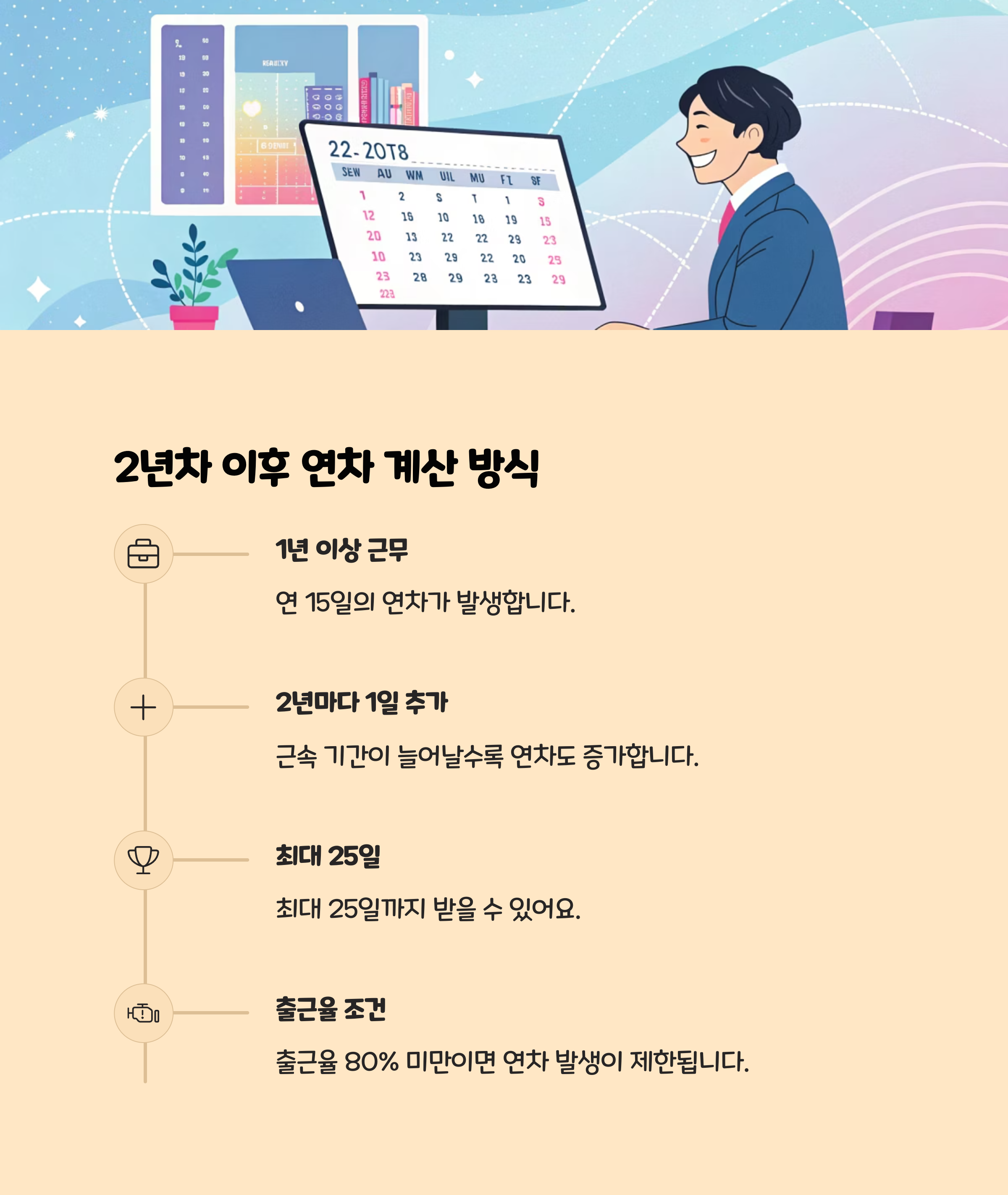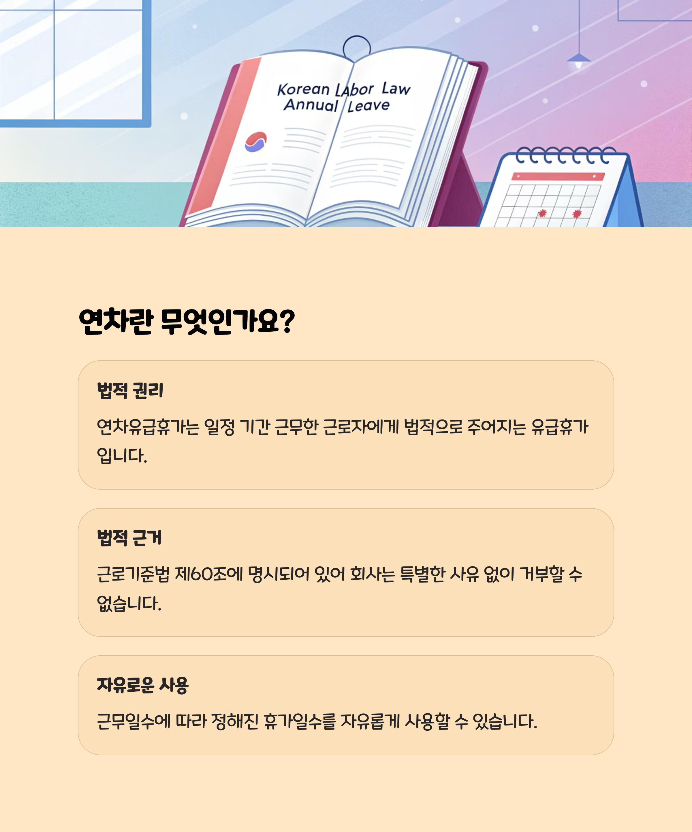 연차휴가는 근로자의 당연한 권리입니다. 근속기간에 따라 달라지는 연차 발생 기준부터 연차 사용 시 꼭 알아야 할 핵심 정보까지 간단히 정리해드립니다.