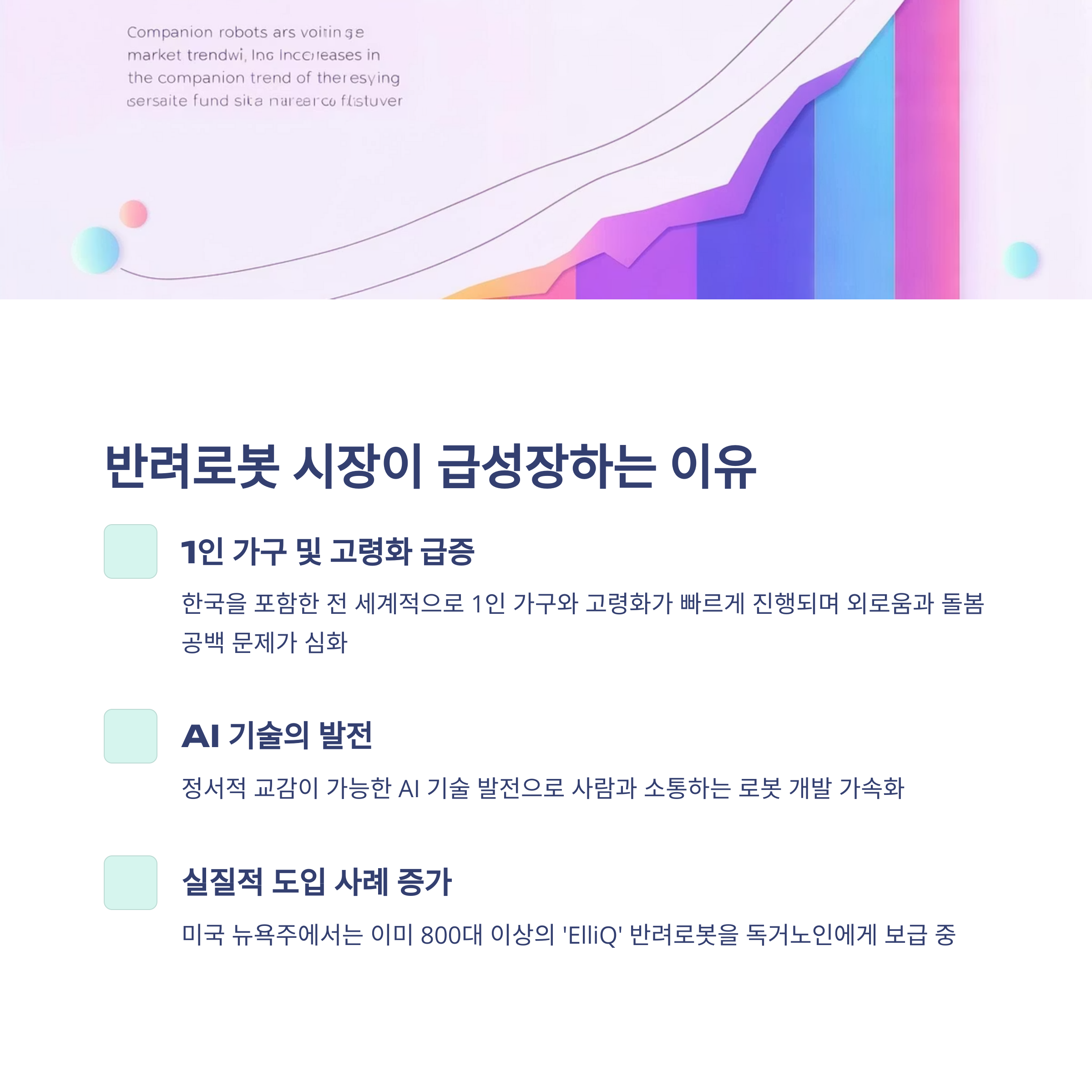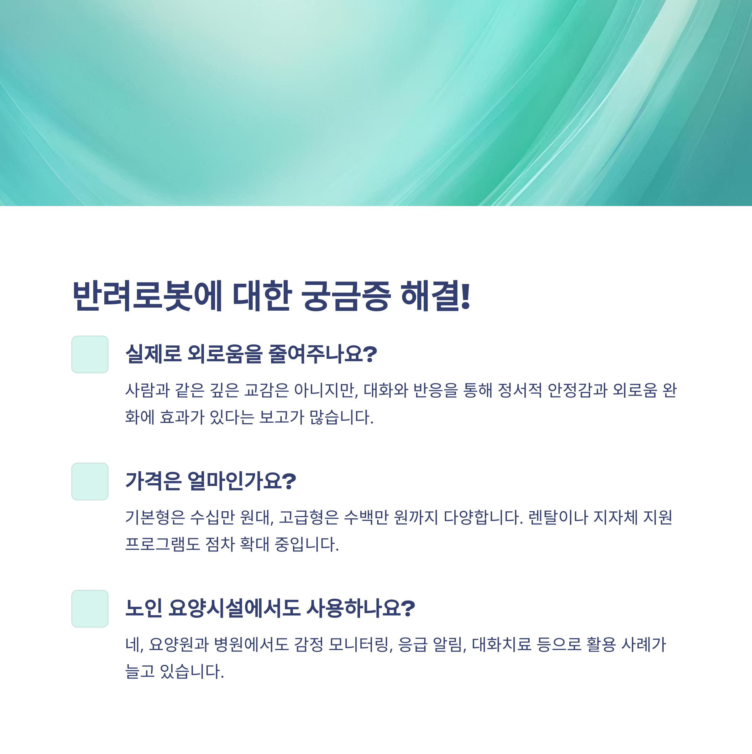 반려로봇은 단순한 IT 제품이 아닌, 외로움이라는 사회 문제에 대한 기술적 해답 중 하나입니다. 특히 독거노인, 1인 가구, 장애인 등 사회적 소외 계층에 실질적인 도움을 줄 수 있는 매개체로 성장 중이에요. 앞으로 가격 접근성과 기술 진보가 더해지면 ‘로봇 친구’가 일상 속에서 당연한 존재가 될 날도 멀지 않아 보입니다.