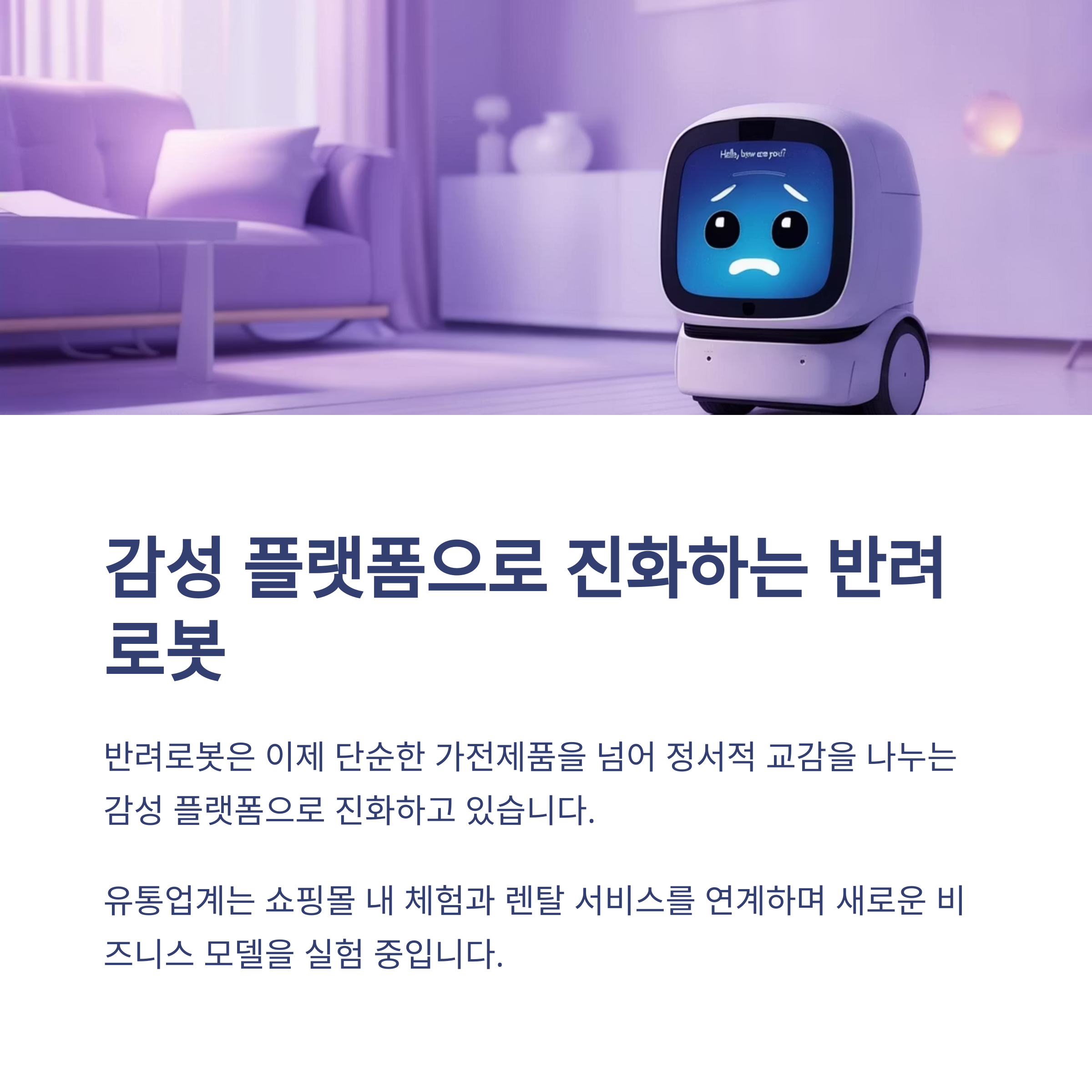LG전자, 하이센스 등 국내외 전자업체들이 본격적으로 관련 제품을 내놓으며, 반려로봇은 이제 단순한 가전제품이 아닌 감성 플랫폼으로 진화 중입니다. 유통업계도 쇼핑몰에서 체험과 렌탈 서비스를 연계하며 새로운 비즈니스 모델을 실험 중이죠.