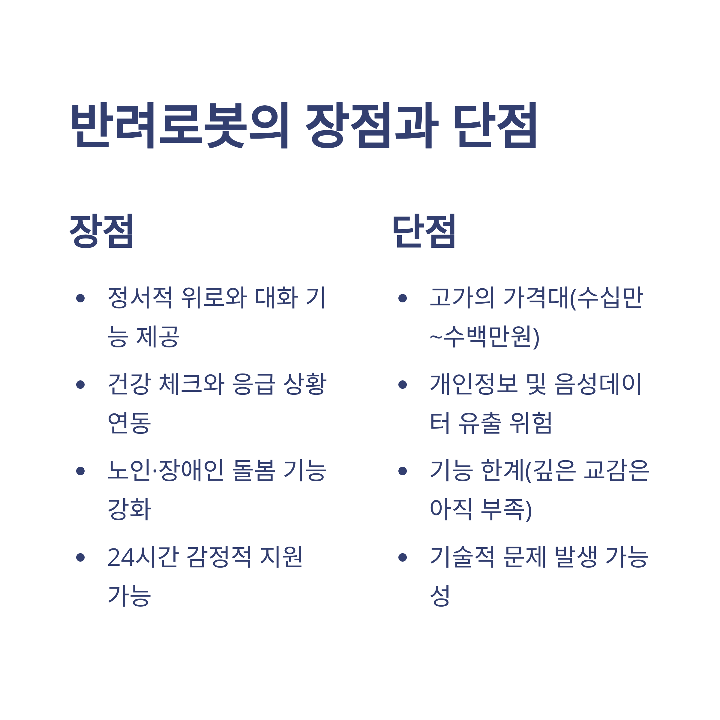 | 정서적 위로 제공 및 대화 기능 | 고가의 가격대 – 수십만 원~수백만 원 |