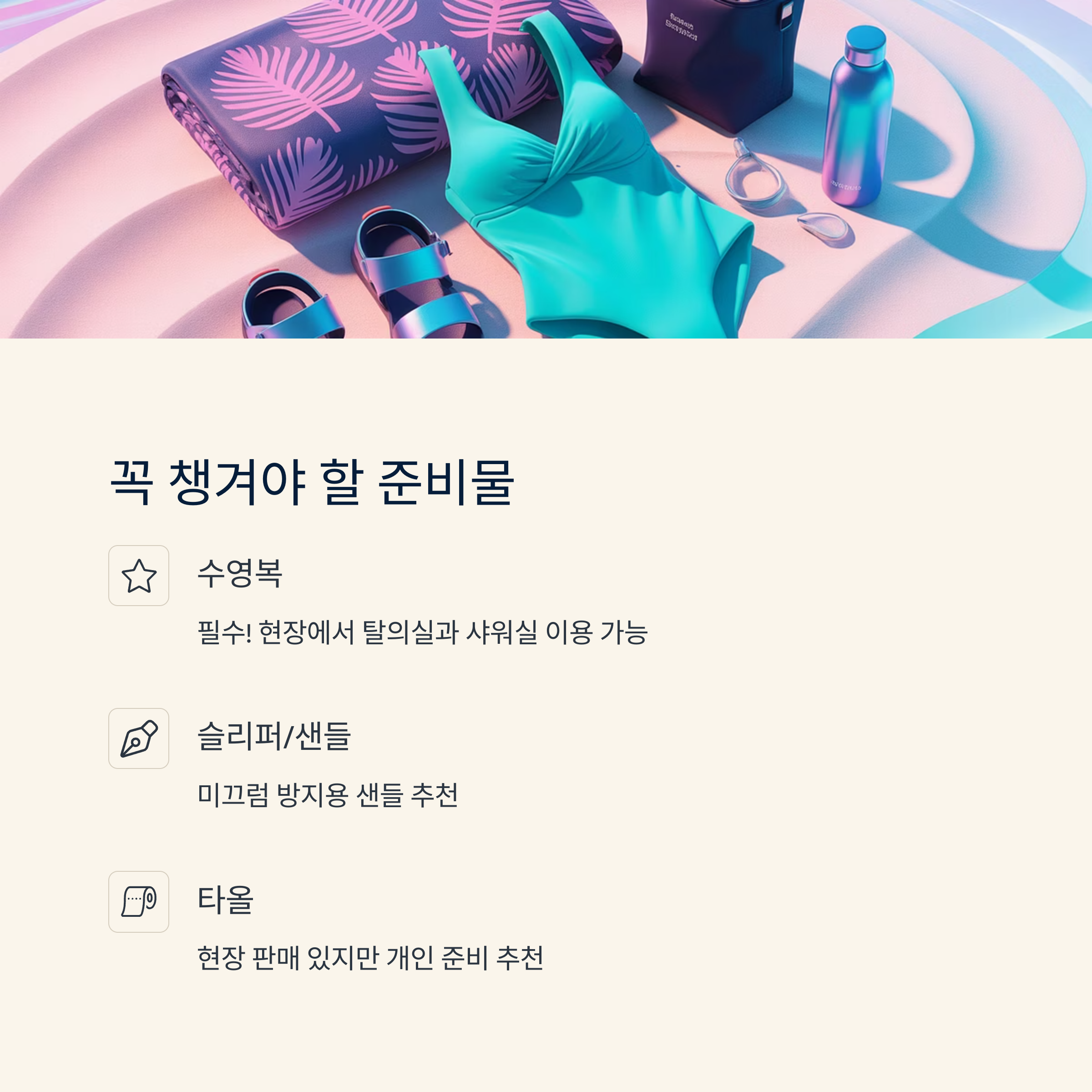| 수영복 착용 | 필수! 현장에서 탈의실과 샤워실 운영 |