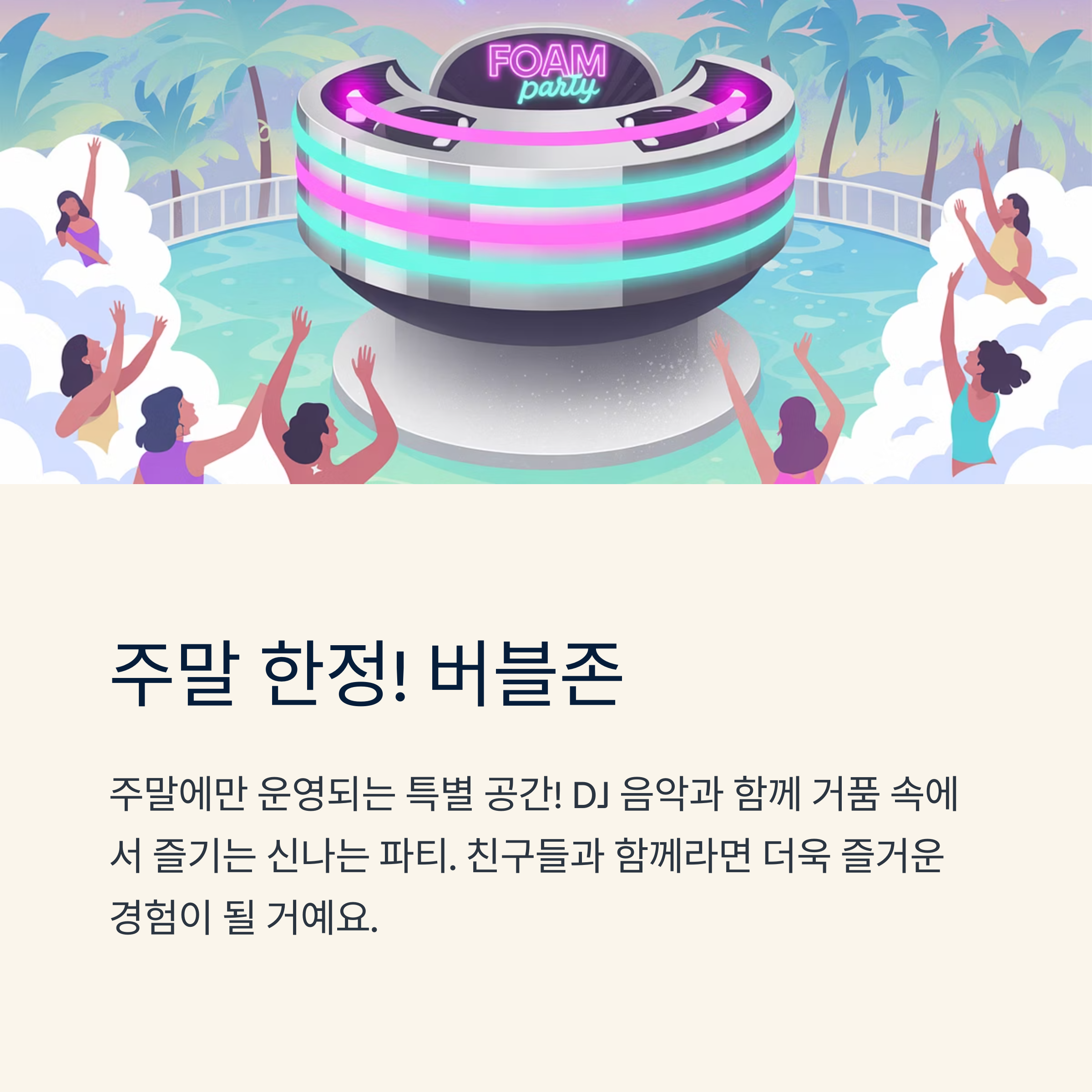- 버블존: 거품 가득한 DJ 파티존 (주말 한정 운영)