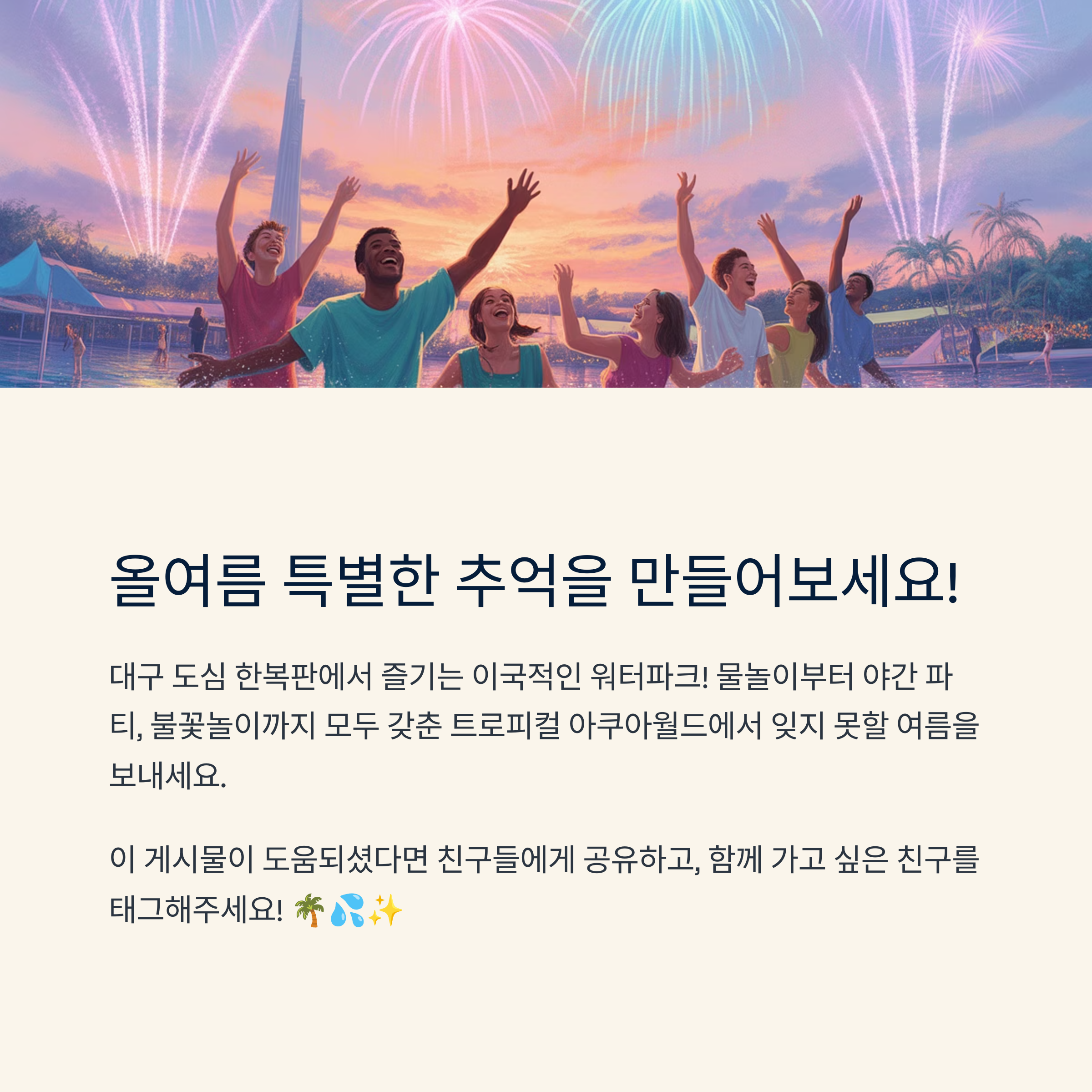 뜨거운 여름, 멀리 갈 필요 없어요. 대구 도심 한복판에서 열대 분위기를 만끽할 수 있는 '트로피컬 아쿠아월드'가 있으니까요! 가족, 친구, 연인 누구와 가도 만족도 200% 보장되는 워터 페스티벌. 물놀이부터 야간 파티, 불꽃놀이까지 모두 갖춘 이색 경험이 기다리고 있답니다. 올여름 특별한 추억 만들고 싶다면 이월드로 떠나보세요. 다녀오신 분들은 댓글로 후기도 함께 나눠주세요. 여러분의 이야기를 기다리고 있을게요 :)