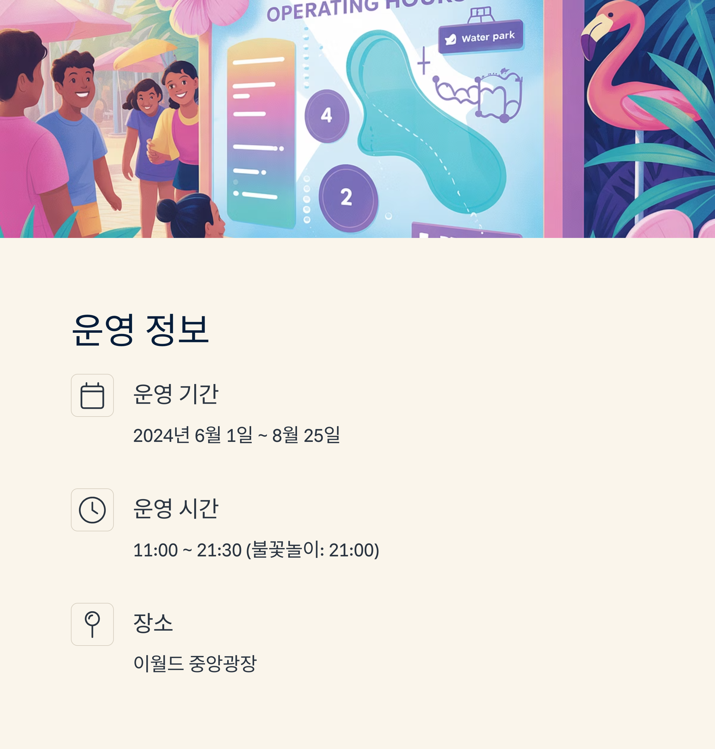 | 운영 시간 | 11:00 ~ 21:30 (불꽃놀이: 21:00) |