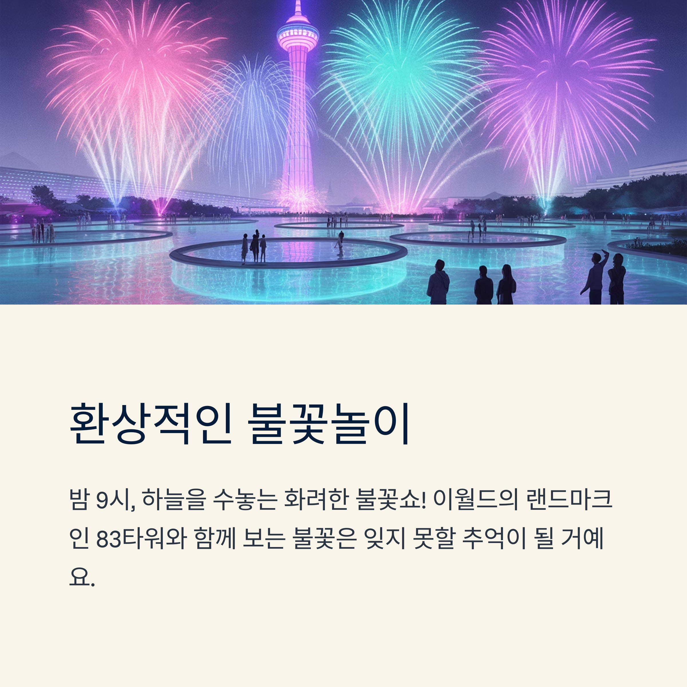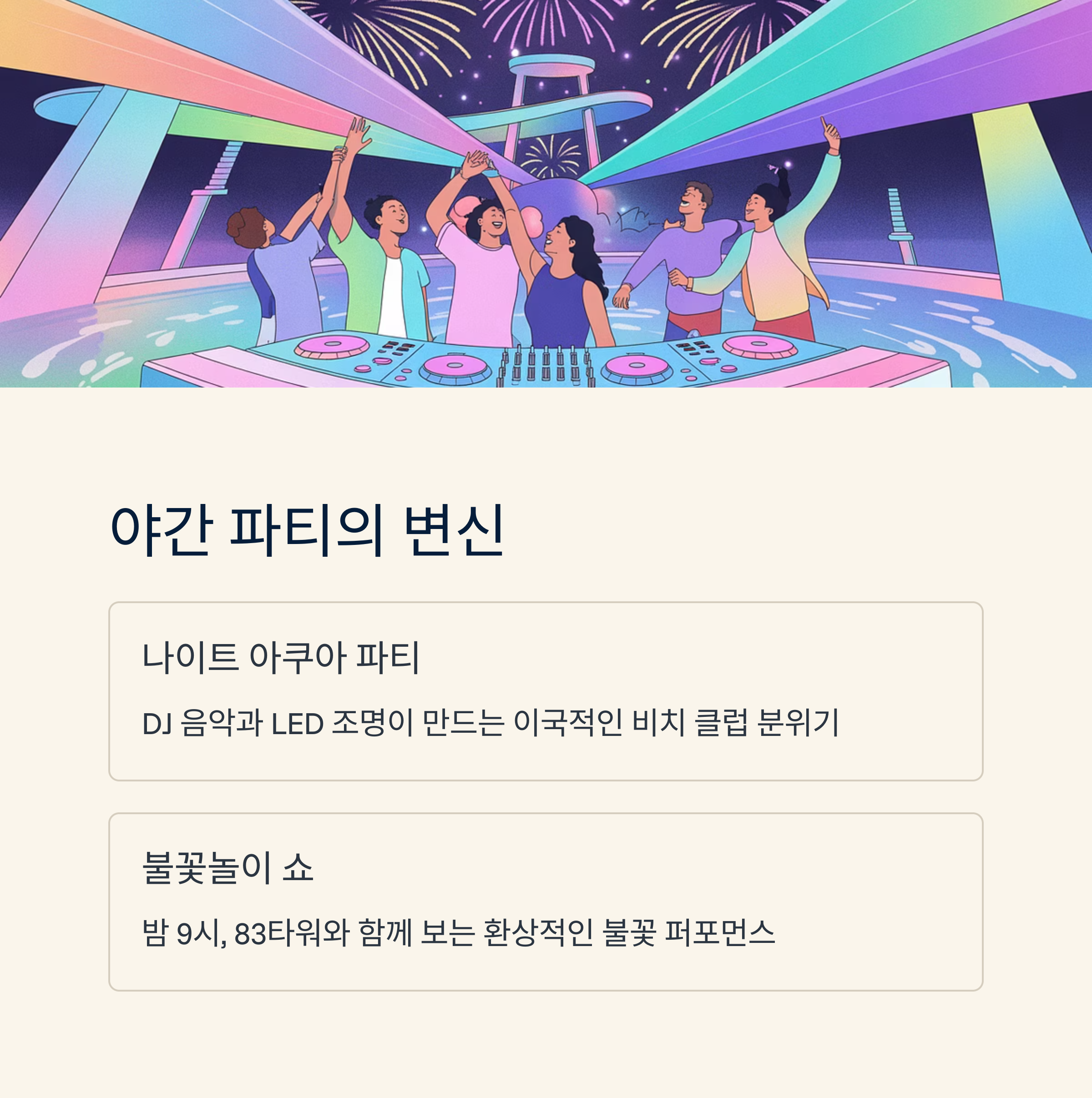 해가 지고 나면 트로피컬 아쿠아월드의 분위기는 완전히 달라져요. 낮의 더위를 날려버린 물놀이가 끝나고, 밤이 되면 DJ 음악과 LED 조명이 어우러지는 '나이트 아쿠아 파티'가 시작되죠. 마치 해외 비치 클럽에 온 것 같은 이국적인 분위기! 그리고 밤 9시, 하늘을 수놓는 불꽃놀이가 대미를 장식합니다. 이월드의 랜드마크인 83타워와 함께 보는 불꽃은 정말 눈물 날 정도로 아름다워요.