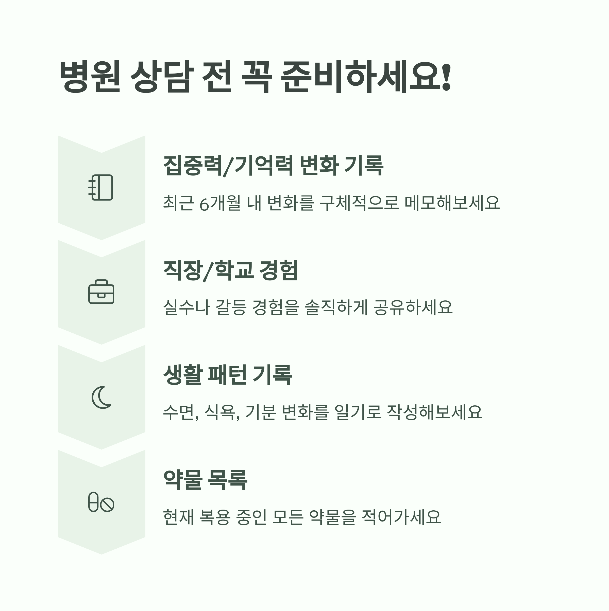 처음 병원에 가면 솔직히 좀 긴장되죠. 어떻게 말해야 할지 모르겠고… 저도 그랬거든요. 그래서 아래 체크리스트를 준비했어요. 상담 전에 꼭 준비해가면 도움이 돼요!
