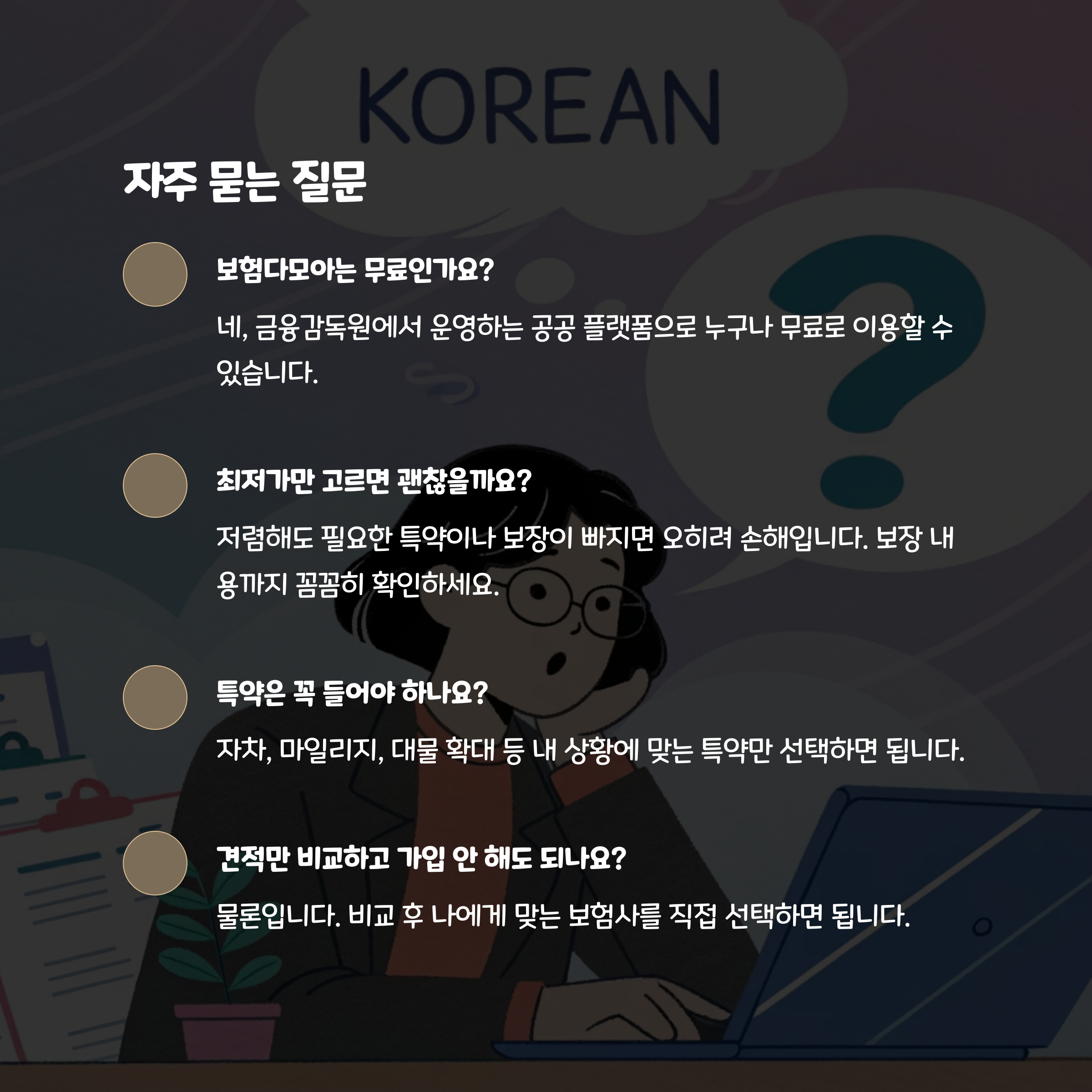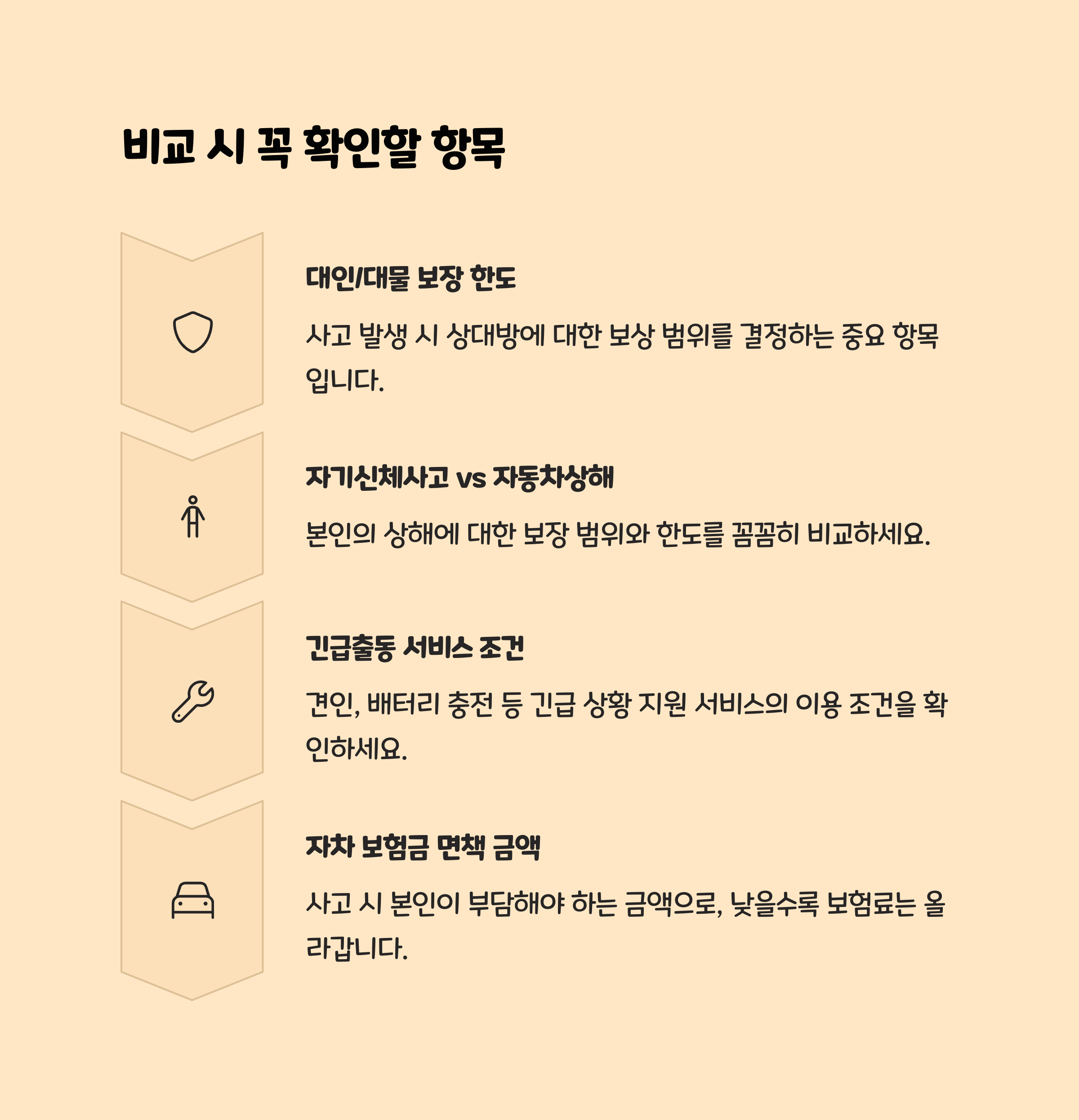 저렴해도 필요한 특약이나 보장이 빠지면 오히려 손해예요. 보장 내용까지 꼼꼼히 봐야 해요.