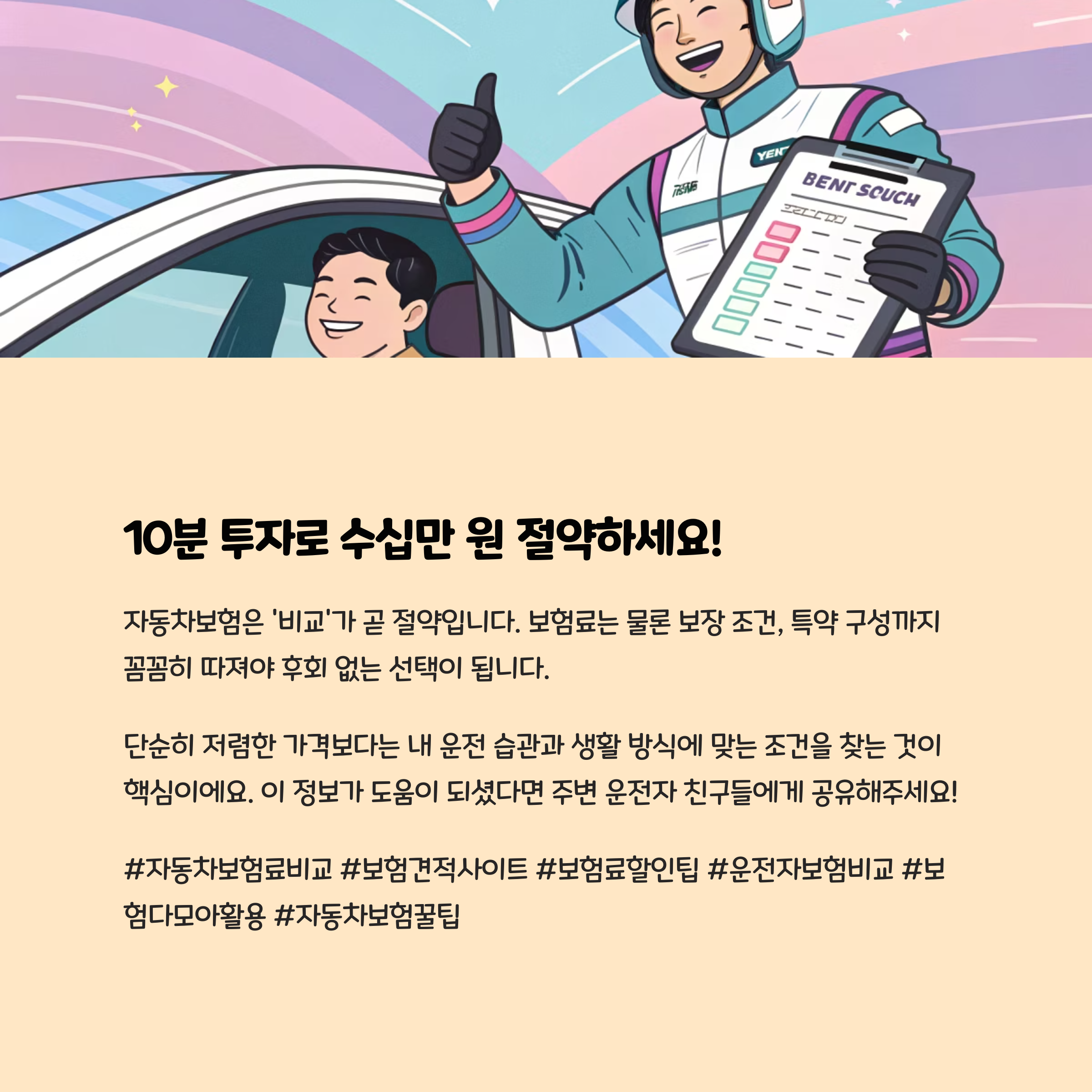 자동차보험은 ‘비교’가 곧 절약이에요. 보험료는 물론 보장 조건, 특약 구성까지 꼼꼼히 따져야 후회 없는 선택이 됩니다. 단순히 저렴한 가격보다는 내 운전 습관과 생활 방식에 맞는 조건을 찾는 것이 핵심이에요. 10분만 투자해도 수십만 원을 절약할 수 있어요!