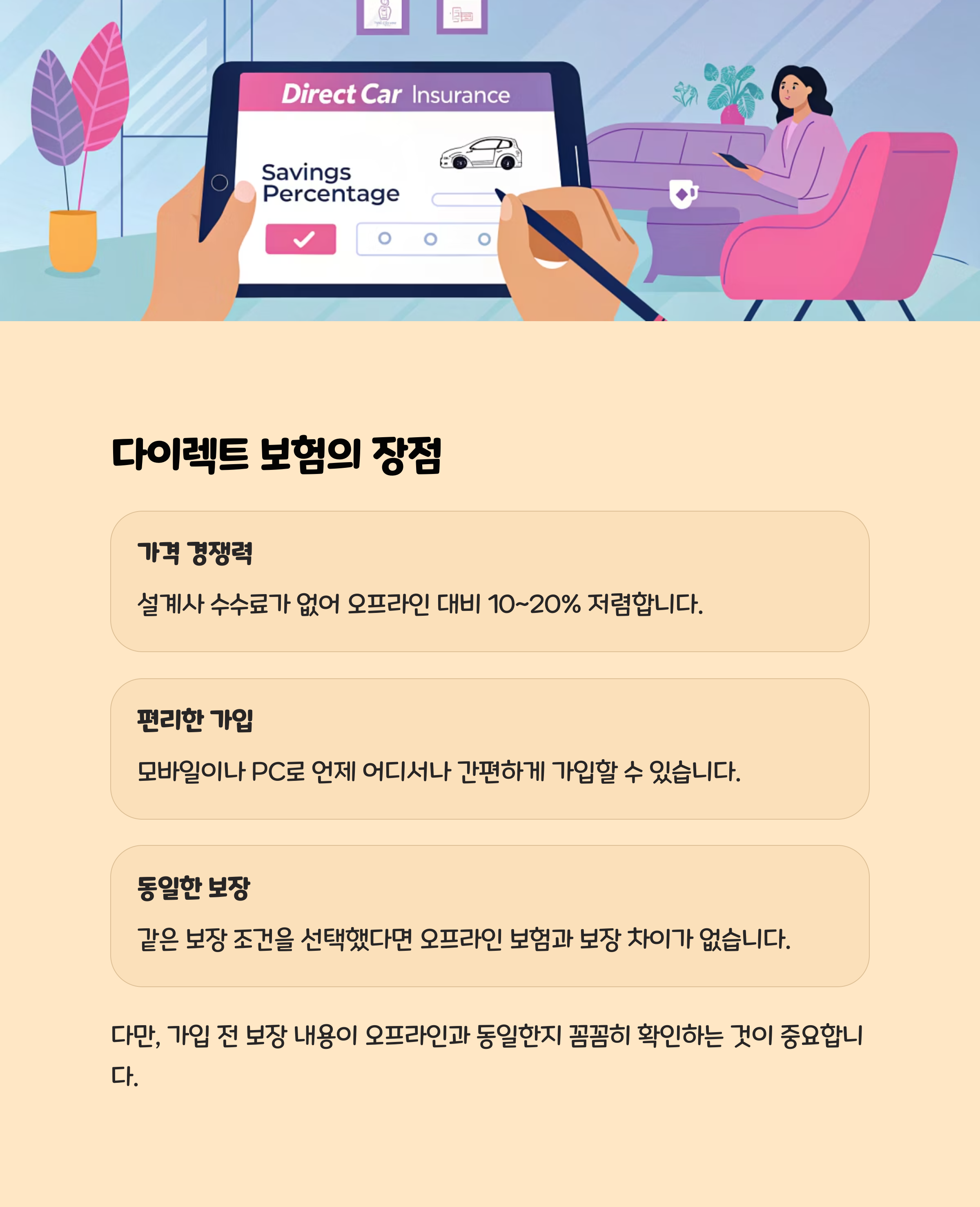 대부분의 경우 오프라인 대비 10~20% 저렴합니다. 설계사를 거치지 않기 때문에 수수료가 빠지고, 간편하게 모바일이나 PC로 가입할 수 있어요. 다만, 보장이 동일한지 꼭 확인해야 합니다.