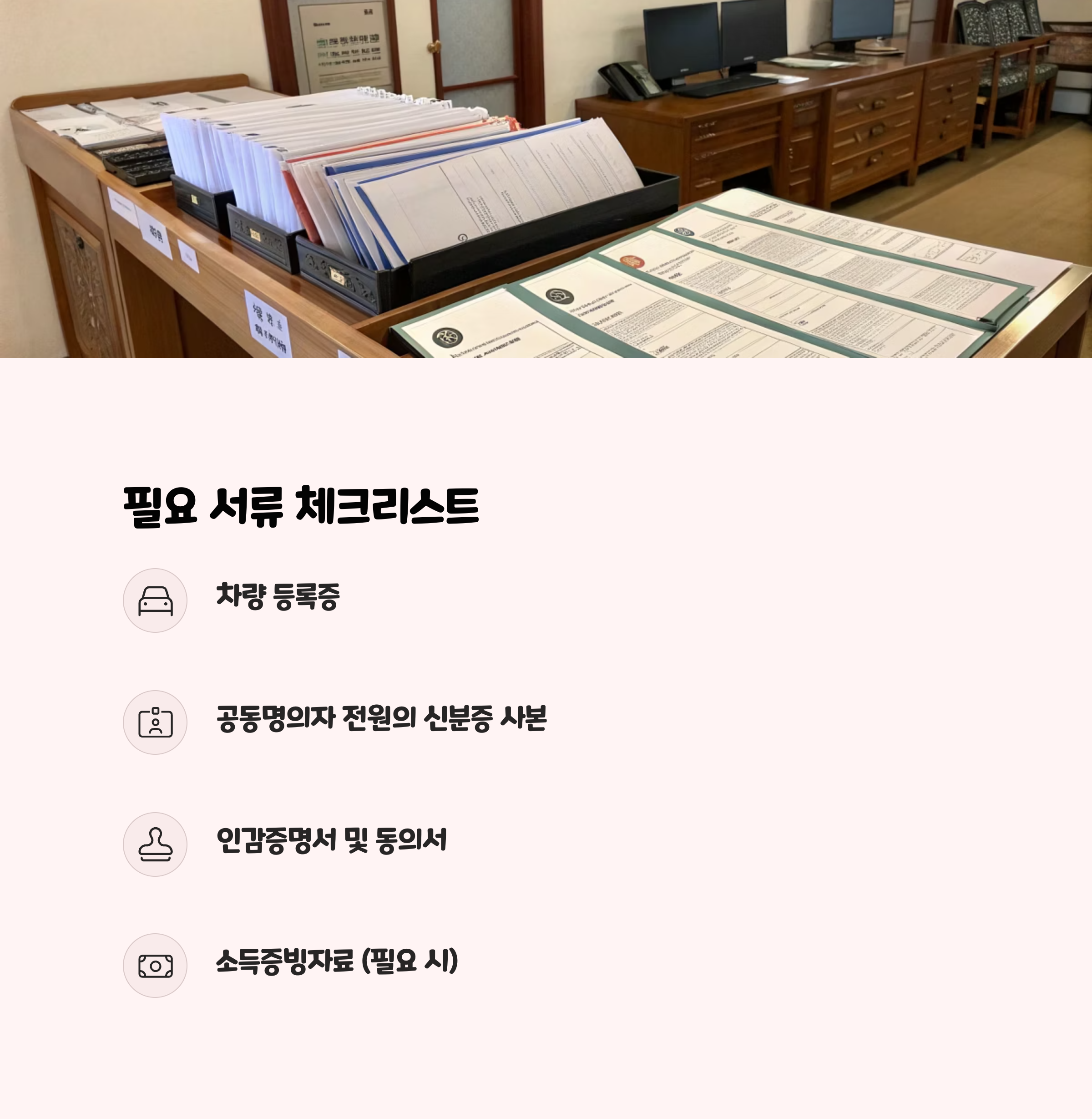 인감증명서, 신분증 사본, 차량 등록증 등 필요