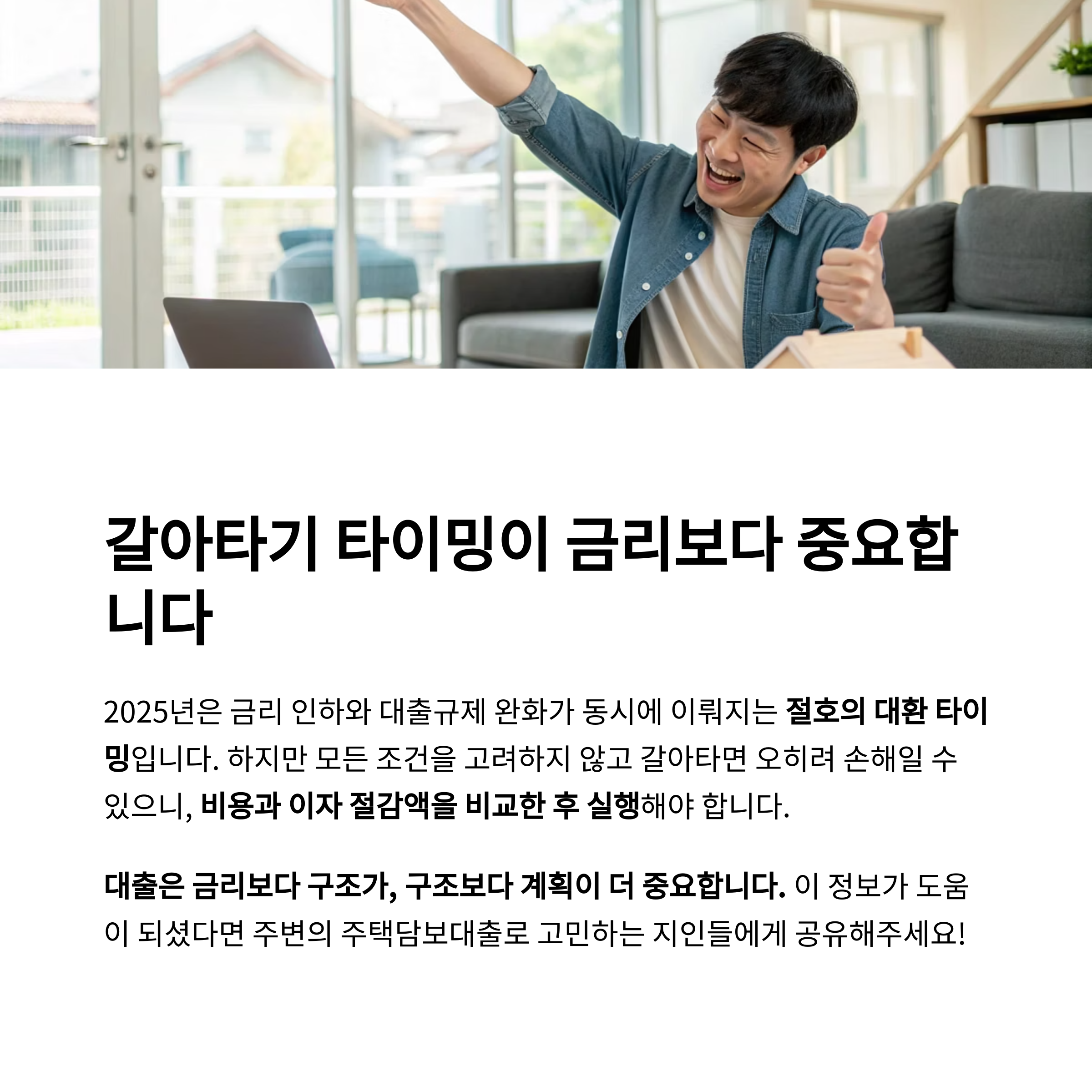 2025년은 금리 인하와 대출규제 완화가 동시에 이뤄지는 절호의 대환 타이밍입니다.