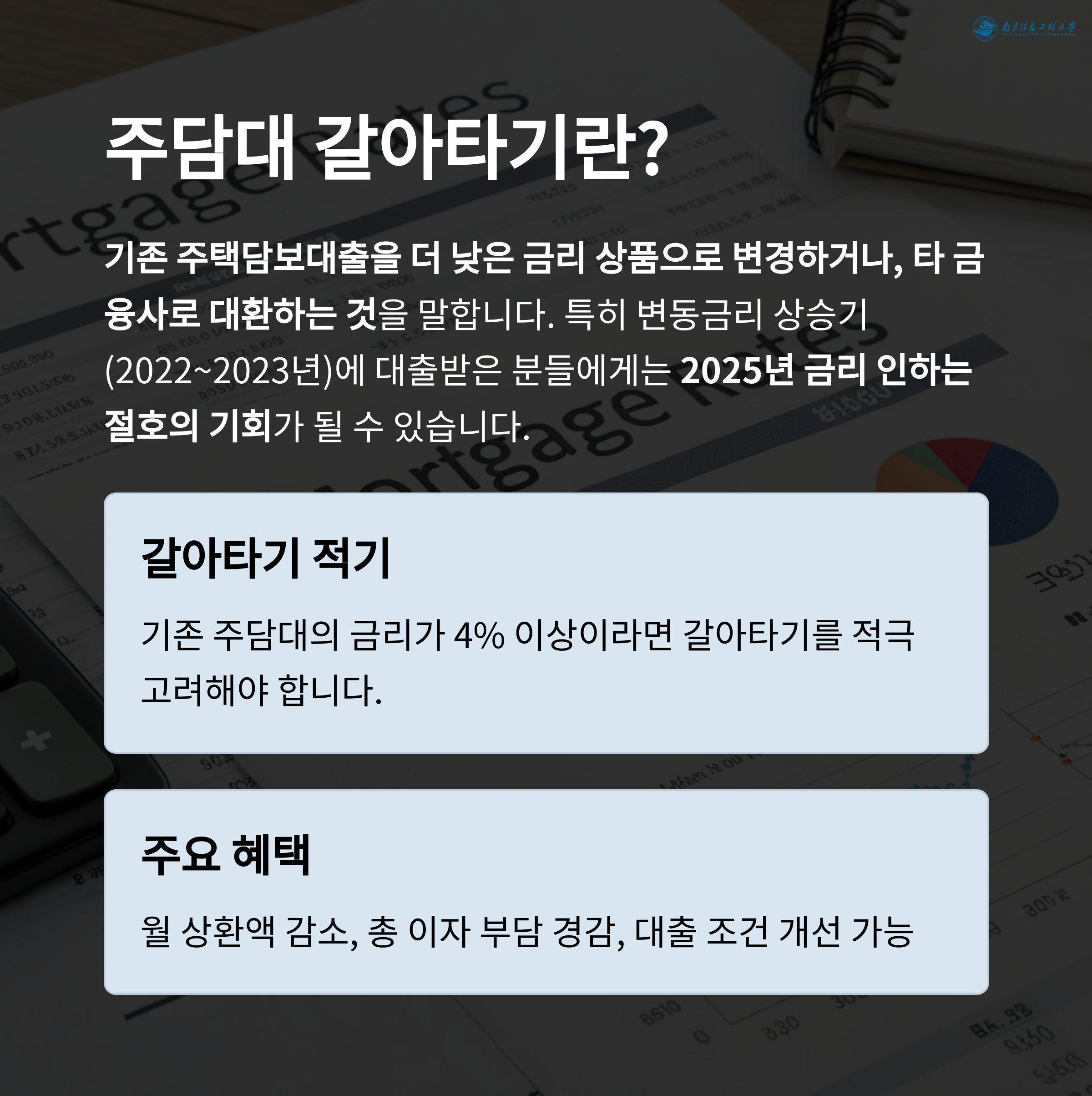2025년 기준금리가 하락하면서 고금리 주택담보대출을 갈아타려는 수요가 폭발적으로 증가하고 있습니다.