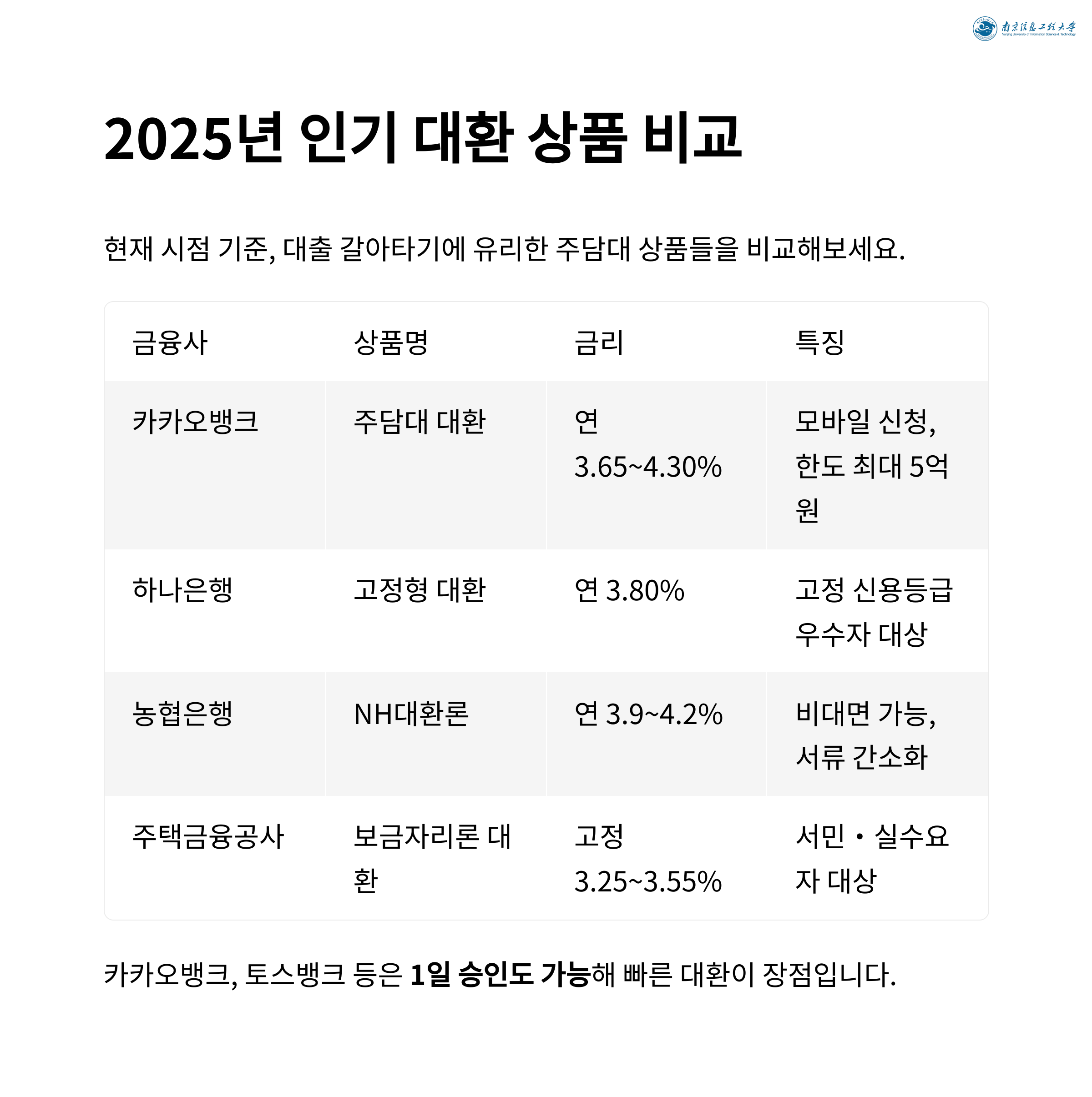 | 농협은행 | NH대환론 | 연 3.9~4.2% | 비대면 가능, 서류 간소화 |