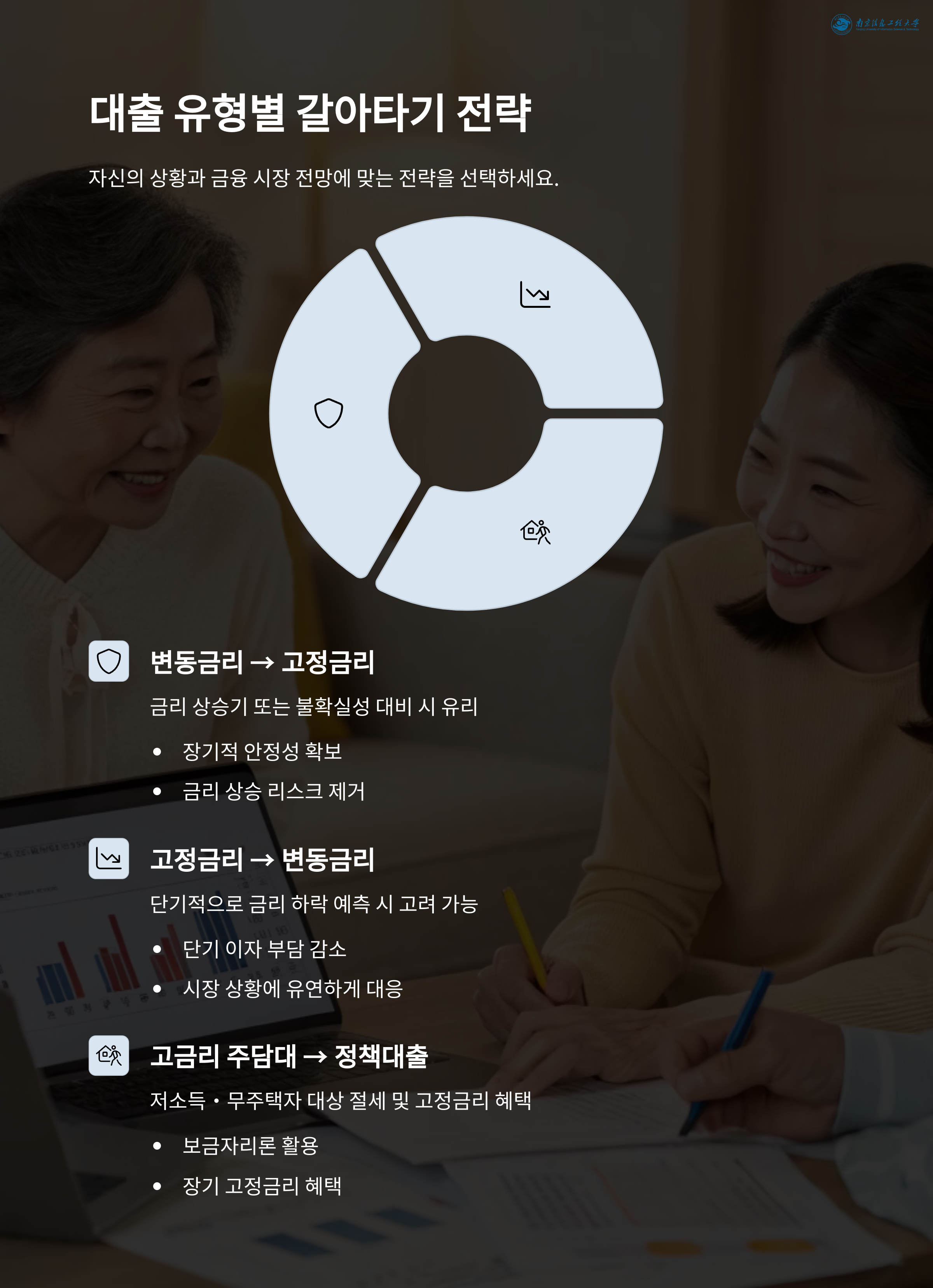 - 고금리 주담대 → 정책대출(보금자리론): 저소득·무주택자 대상 절세 및 고정금리 혜택