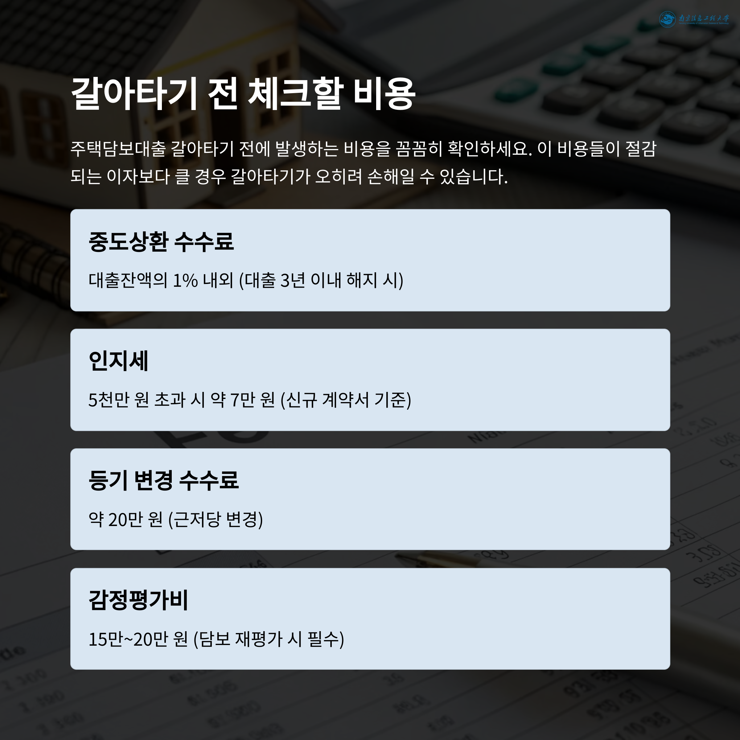 | 감정평가비 | 15만~20만 원 | 담보 재평가 시 필수 |