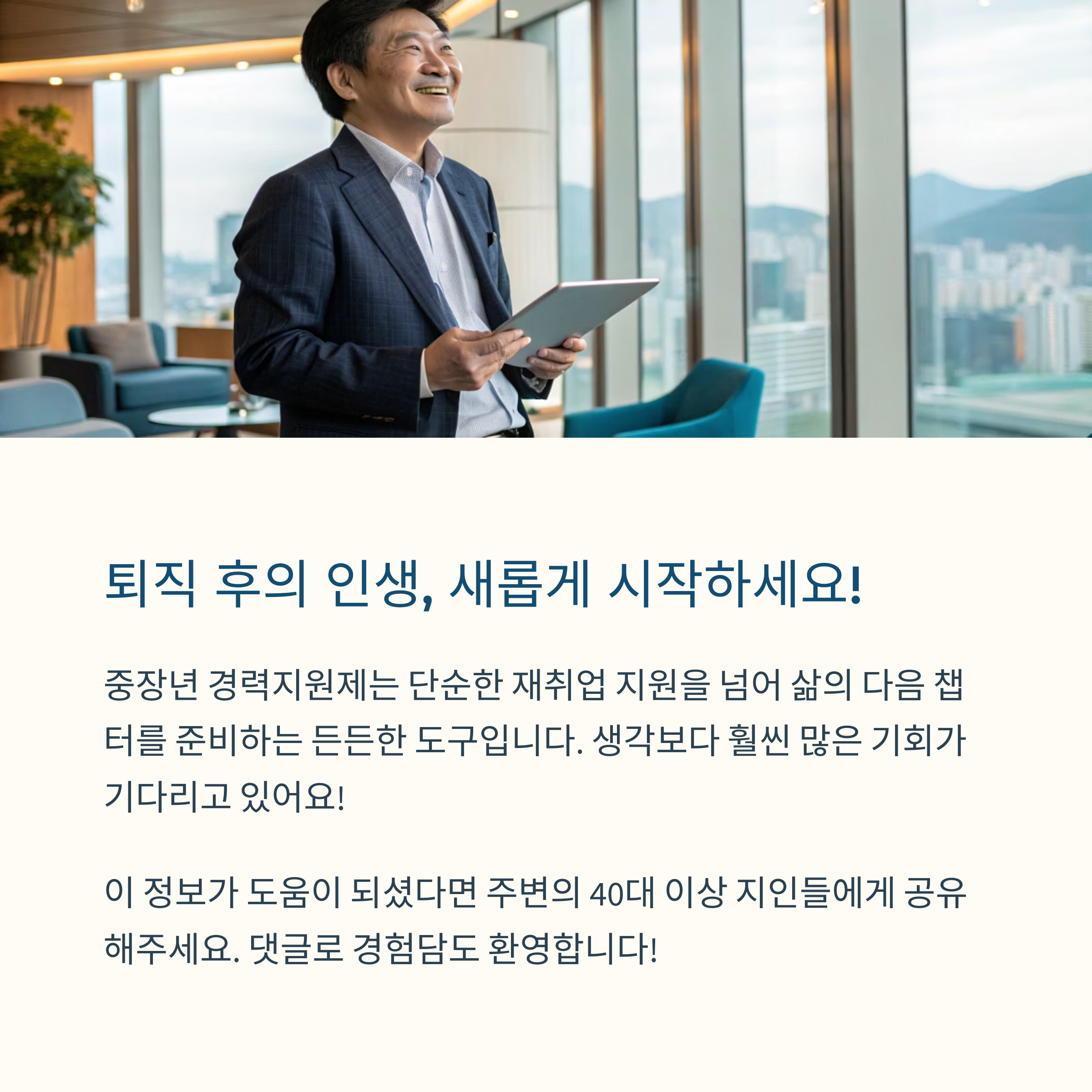 이제는 퇴직 후의 인생도 충분히 새롭게 시작할 수 있는 시대입니다. 중장년 경력지원제는 단순한 재취업 지원을 넘어서, 삶의 다음 챕터를 준비하는 든든한 도구가 되어줍니다. 한 번 도전해보세요. 생각보다 훨씬 많은 기회가 기다리고 있을 거예요! 궁금한 점은 댓글로 자유롭게 남겨주세요. 경험담도 환영합니다!