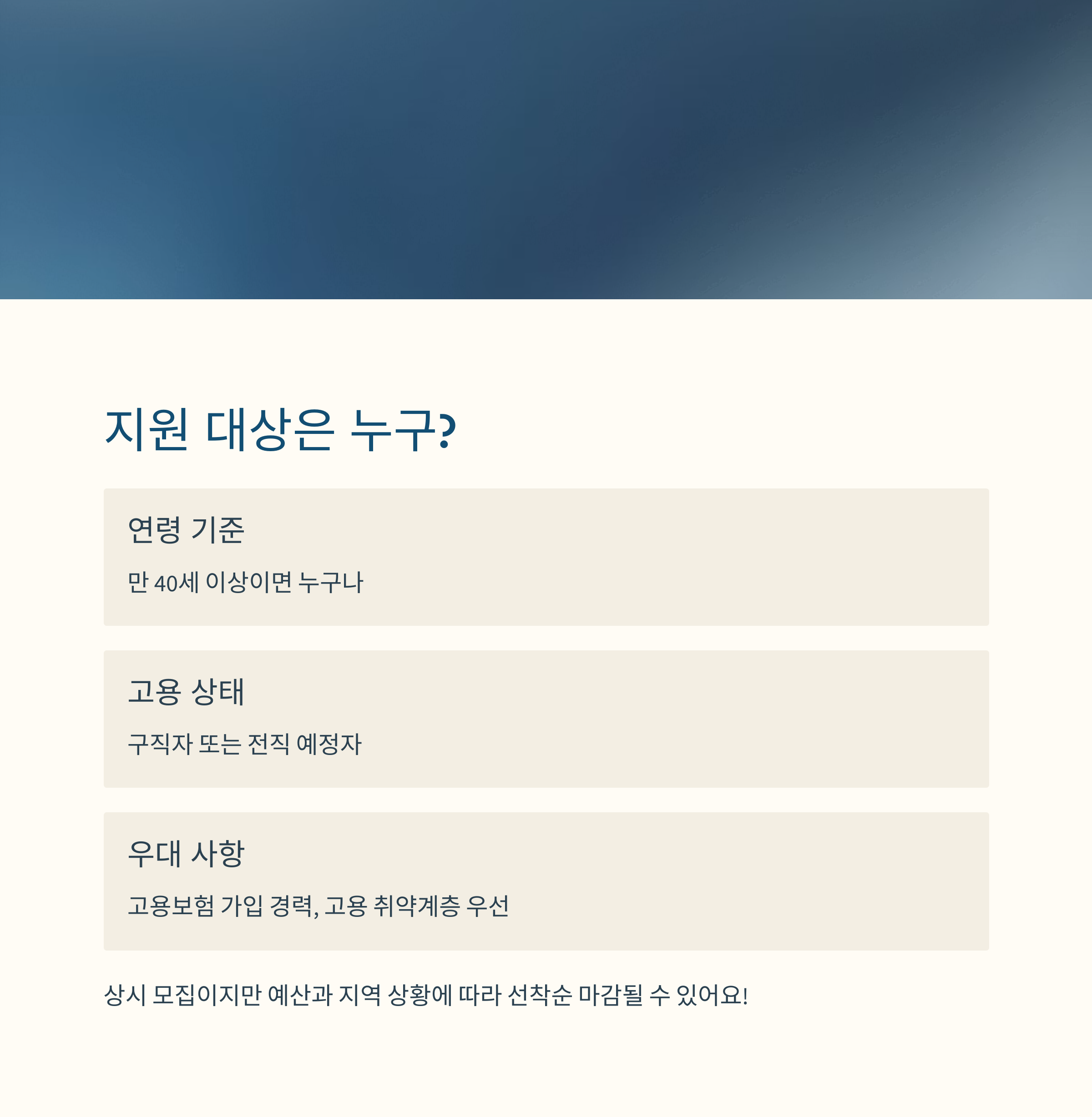 만 40세 이상이면 누구나 지원 가능하지만, 일정 조건을 충족해야 합니다. 특히 고용보험 이력이나 구직 상태 등이 고려돼요.