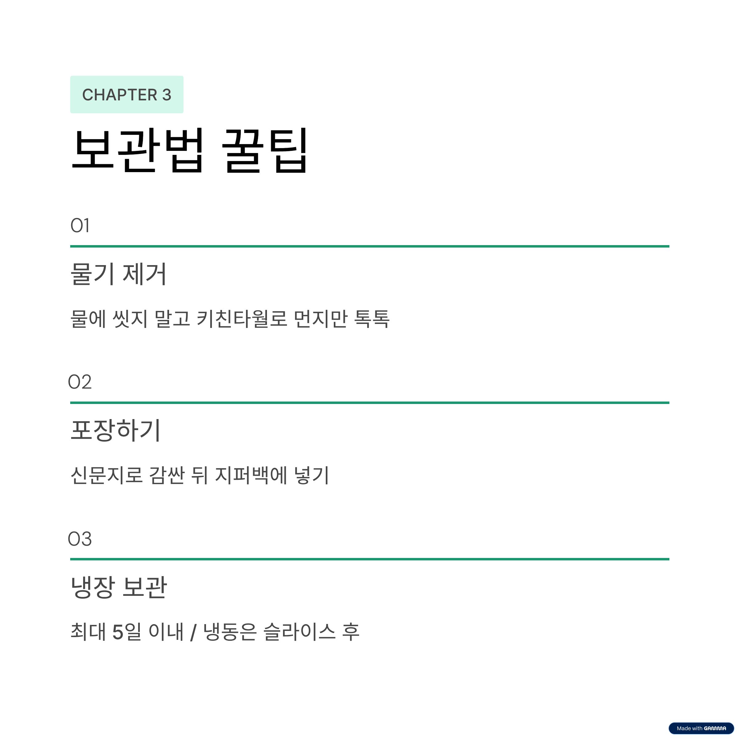 - 길게 보관하려면 슬라이스 후 냉동 보관