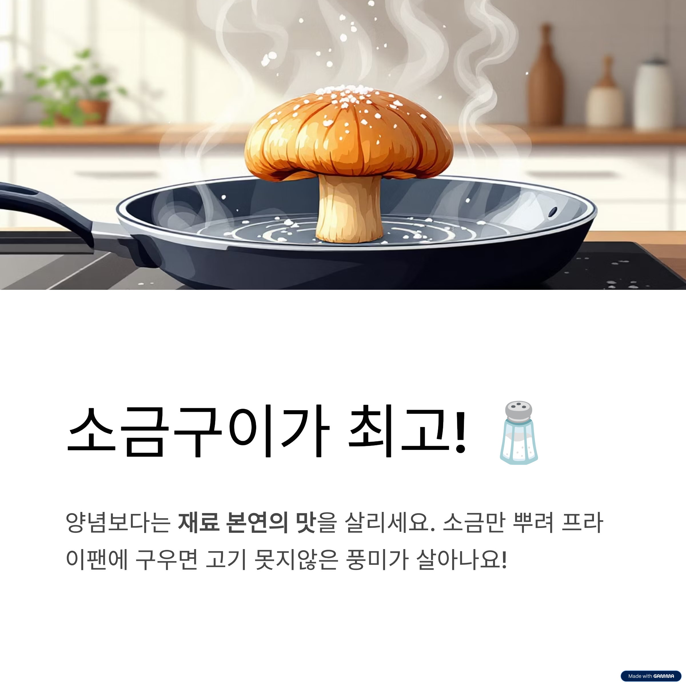 참송이버섯은 향이 진해서 양념보다는 재료 본연의 맛을 살려주는 조리법이 좋아요. 특히 구워 먹으면 고기 못지않은 풍미가 느껴진답니다. 가장 기본은 역시 ‘소금만 뿌려서’ 프라이팬에 구워 먹는 것! 하지만 이 외에도 다양한 요리법이 있죠.