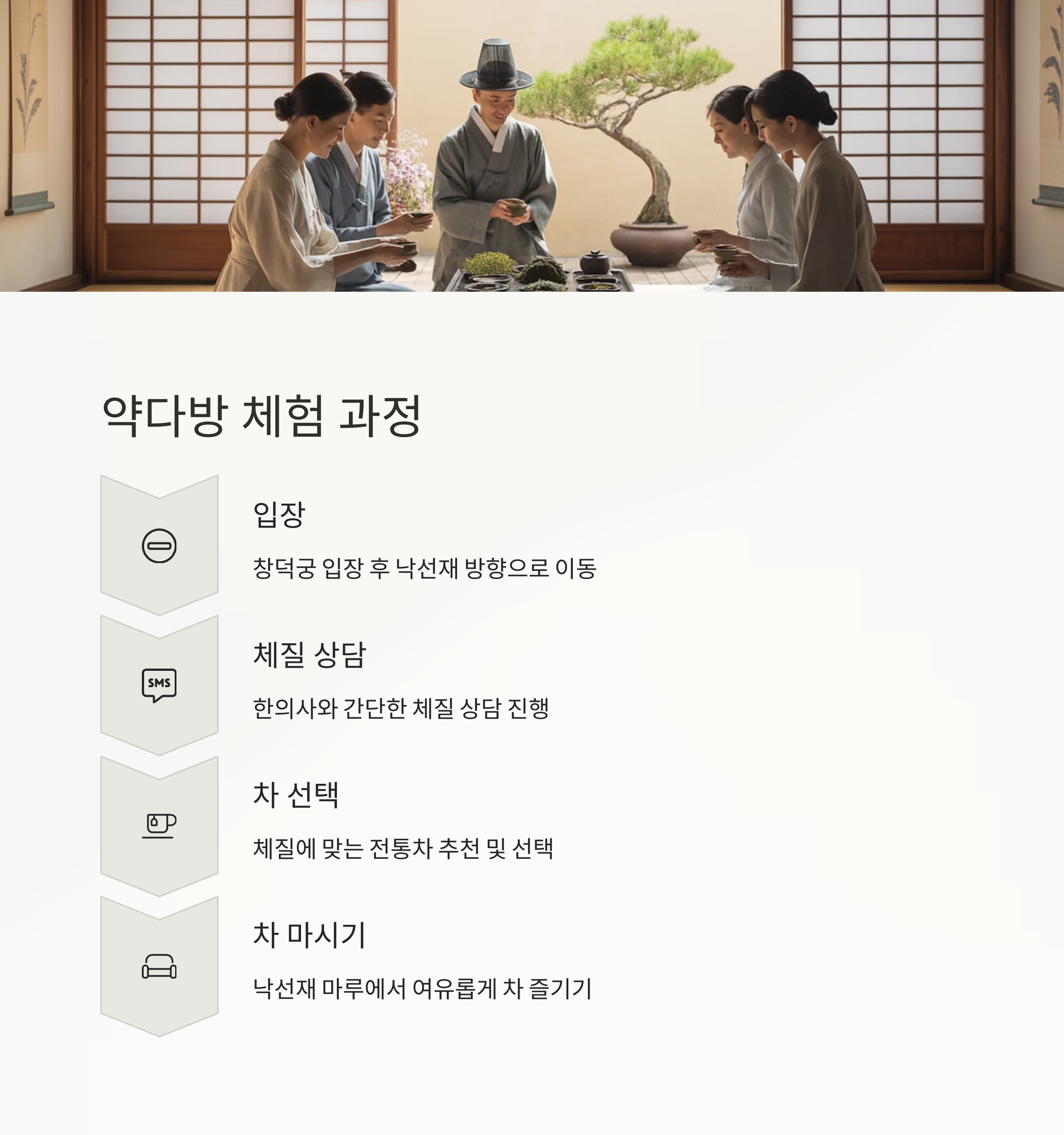 솔직히 처음에는 ‘궁에서 차를 마신다?’는 생각에 반신반의했어요. 그런데 막상 도착해서 낙선재 마루에 앉아 약차 한 잔을 마시니, 마음이 스르르 녹더라고요. 주변 풍경도 예술이에요. 초록이 가득한 정원과 고즈넉한 건물들 사이에서 조용히 흘러가는 시간… 그 순간만큼은 스마트폰도, 걱정도 내려놓게 되더라고요. 개인적으로 추천하고 싶은 BEST 힐링 장소예요.