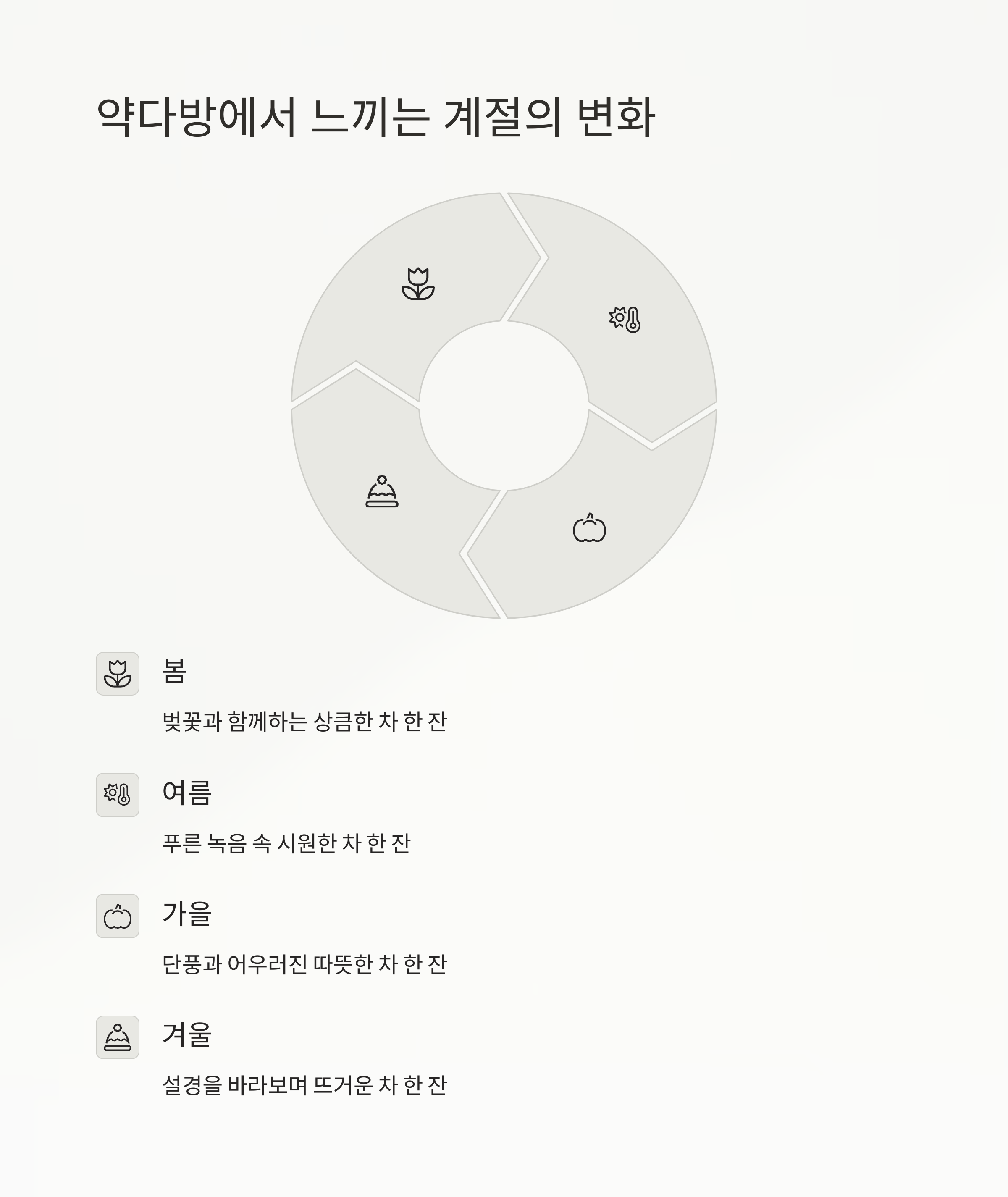 약다방에서는 각자의 체질과 건강 상태에 따라 맞춤 전통차를 제공해요. 현장에서 간단한 체질 상담을 받은 후, 어울리는 차를 선택할 수 있어요. 아래는 대표적인 차 종류예요.