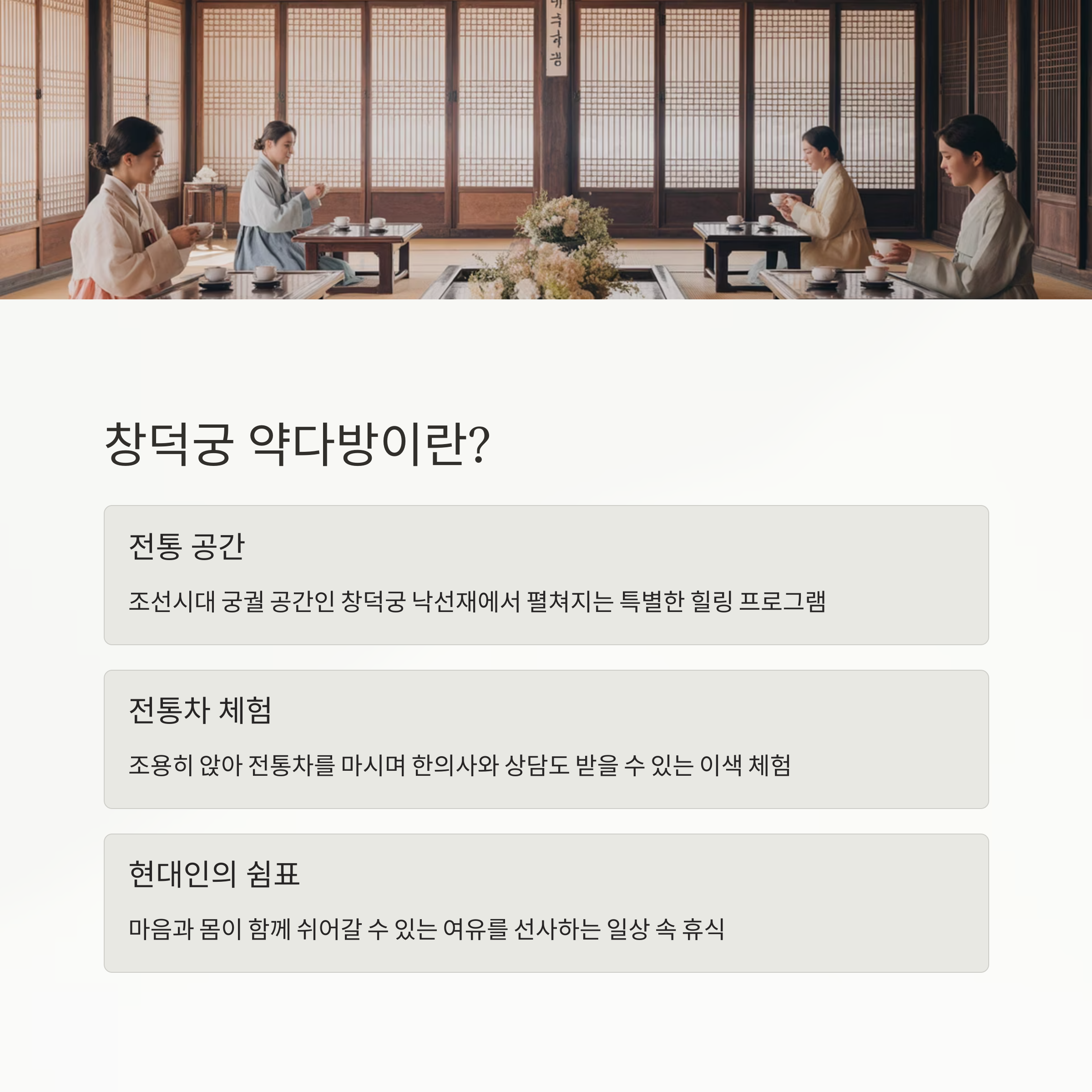 창덕궁 약다방은 조선시대 궁궐 공간에서 펼쳐지는 특별한 힐링 프로그램이에요. 역사적 공간인 창덕궁 낙선재에서 조용히 앉아 전통차를 마시며 한의사와 상담도 받을 수 있는 이색 체험이랍니다. 단순한 티타임을 넘어, 마음과 몸이 함께 쉬어갈 수 있는 여유를 선사하죠. 일상에 지친 현대인들에게 꼭 필요한 쉼표 같은 시간이랄까요.