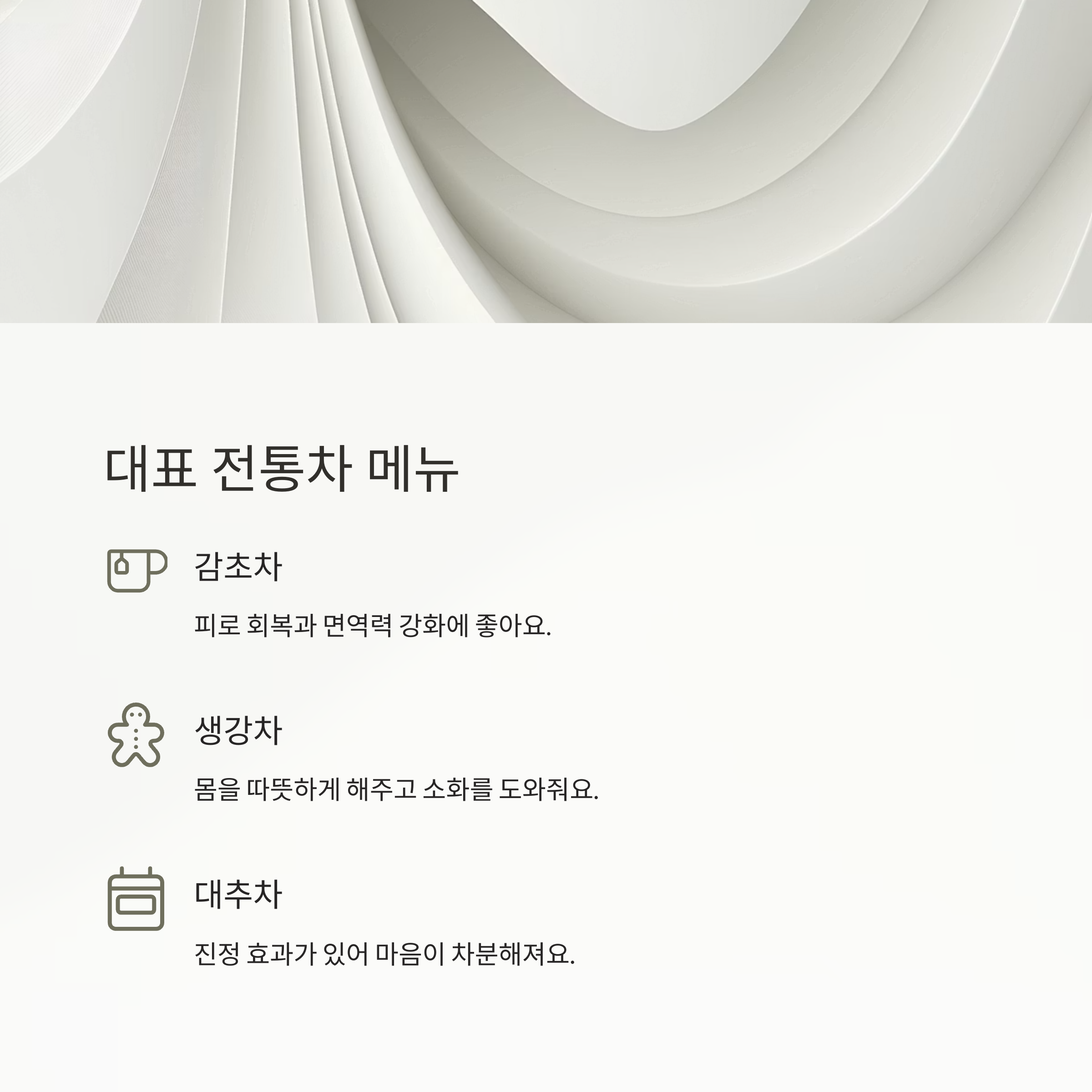 - 생강차 – 몸을 따뜻하게 해주고 소화를 도와줘요.