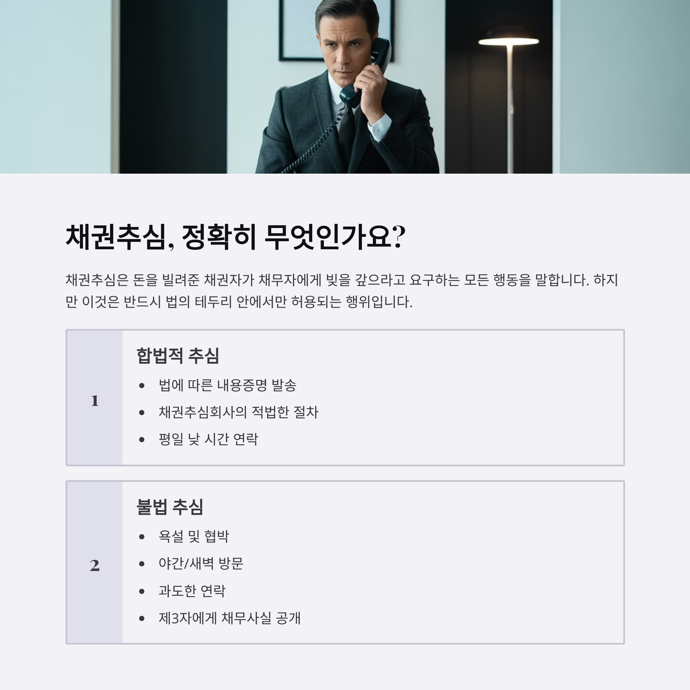 추심은 크게 '합법적 추심'과 '불법추심'으로 나뉘어요. 합법적 추심은 채권자가 법에 따라 내용증명을 보내거나, 채권추심회사에 의뢰해 적법한 절차로 채무 상환을 요구하는 방식입니다. 반면, 무작정 욕설, 협박, 새벽 방문 같은 건 명백한 불법이라는 거죠.