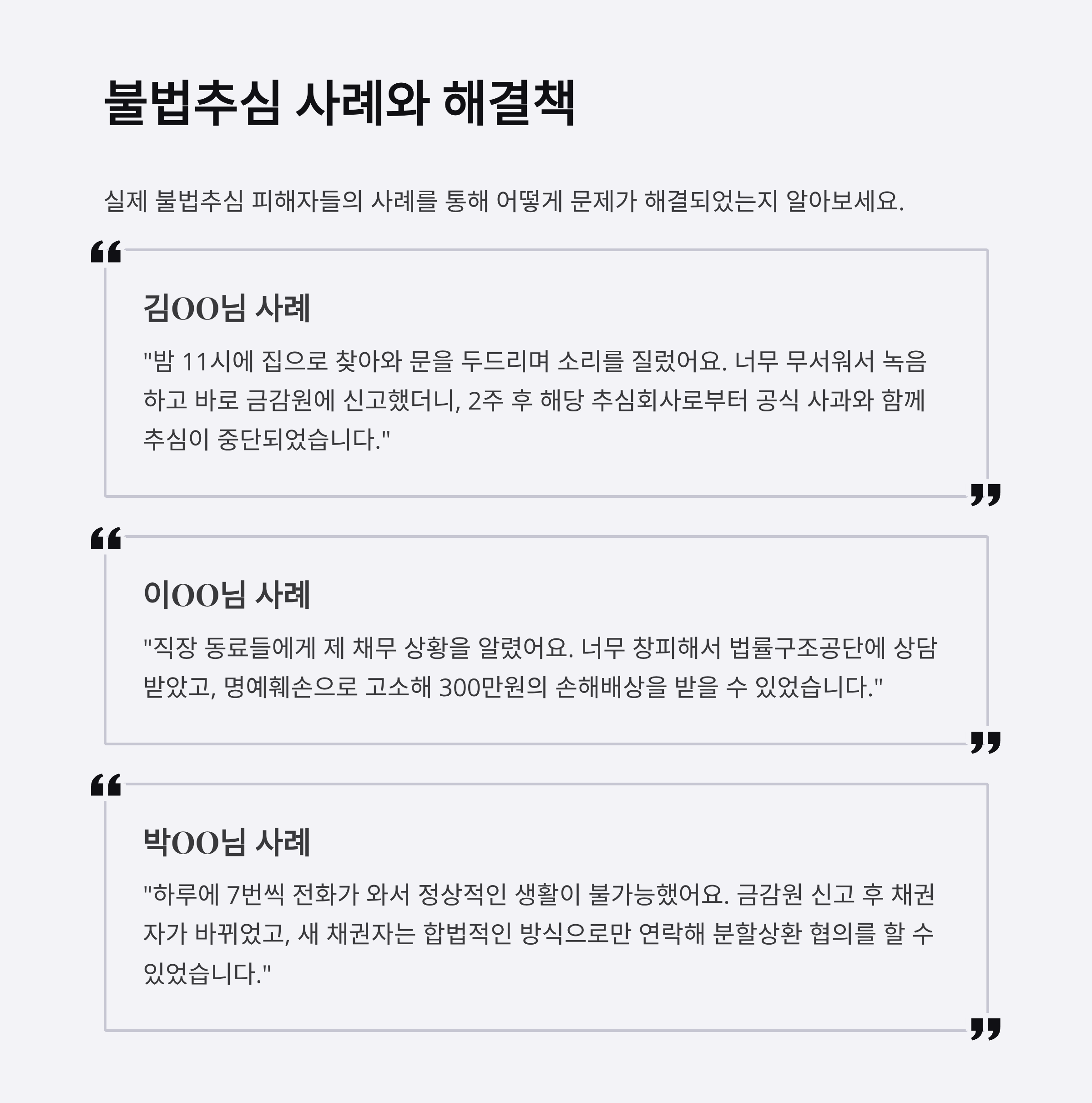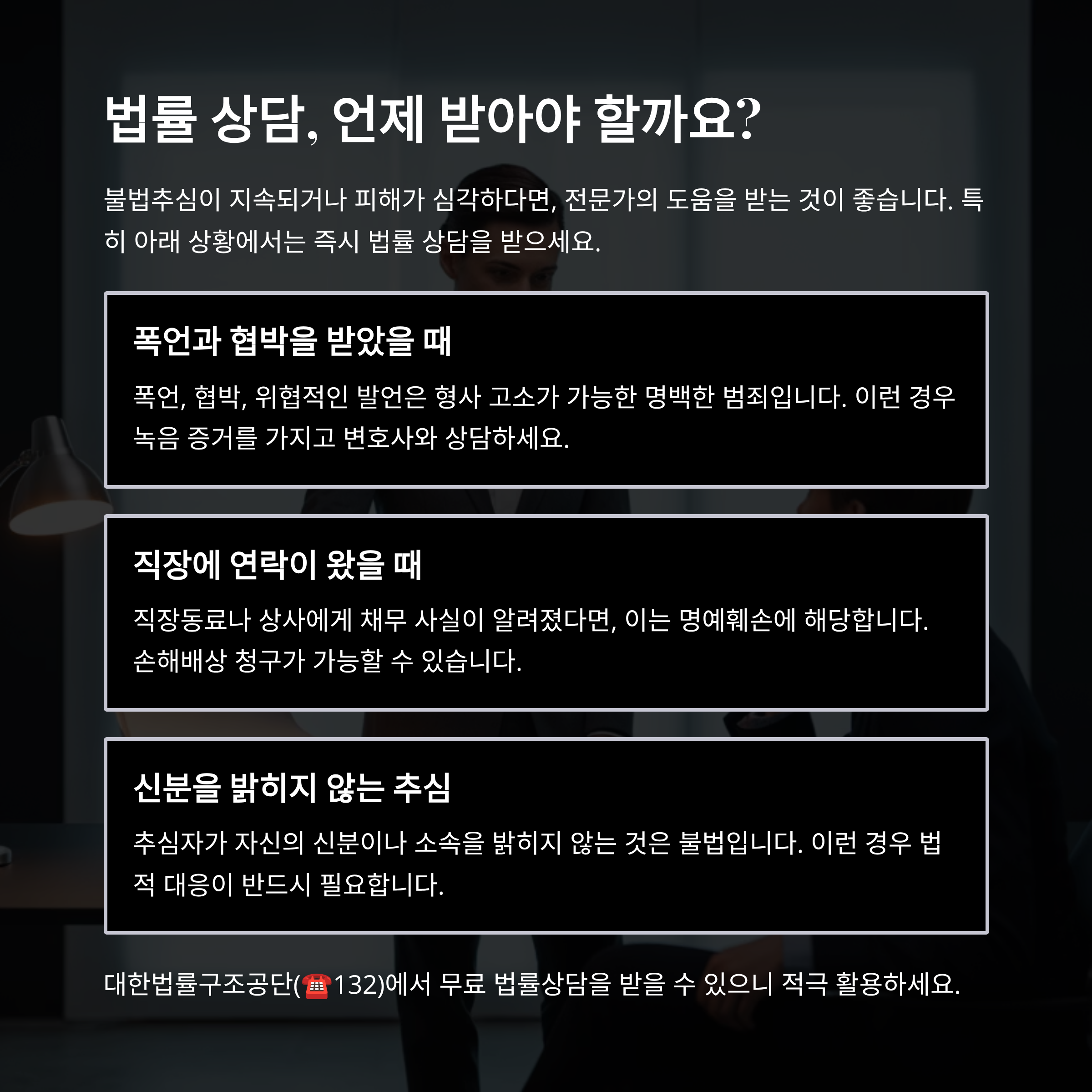 불법추심이 계속되거나 법적인 대응이 필요해 보인다면, 망설이지 말고 전문가를 찾아야 합니다. 특히 아래 상황에 해당된다면 즉시 상담을 권합니다.