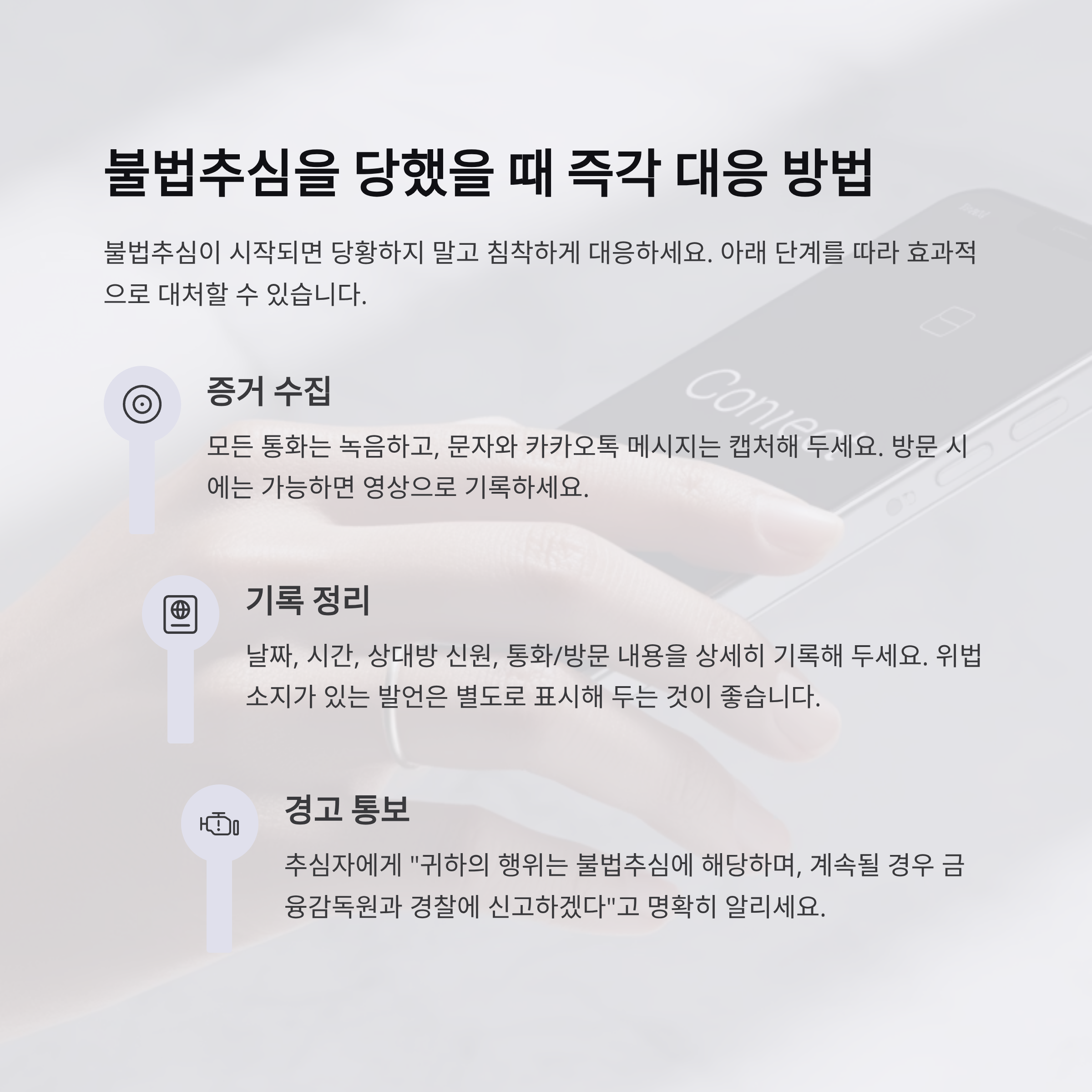 불법추심이 시작됐을 때, 당황하지 마세요. 아래 리스트를 꼭 기억해두셨다가 바로 대응하세요!