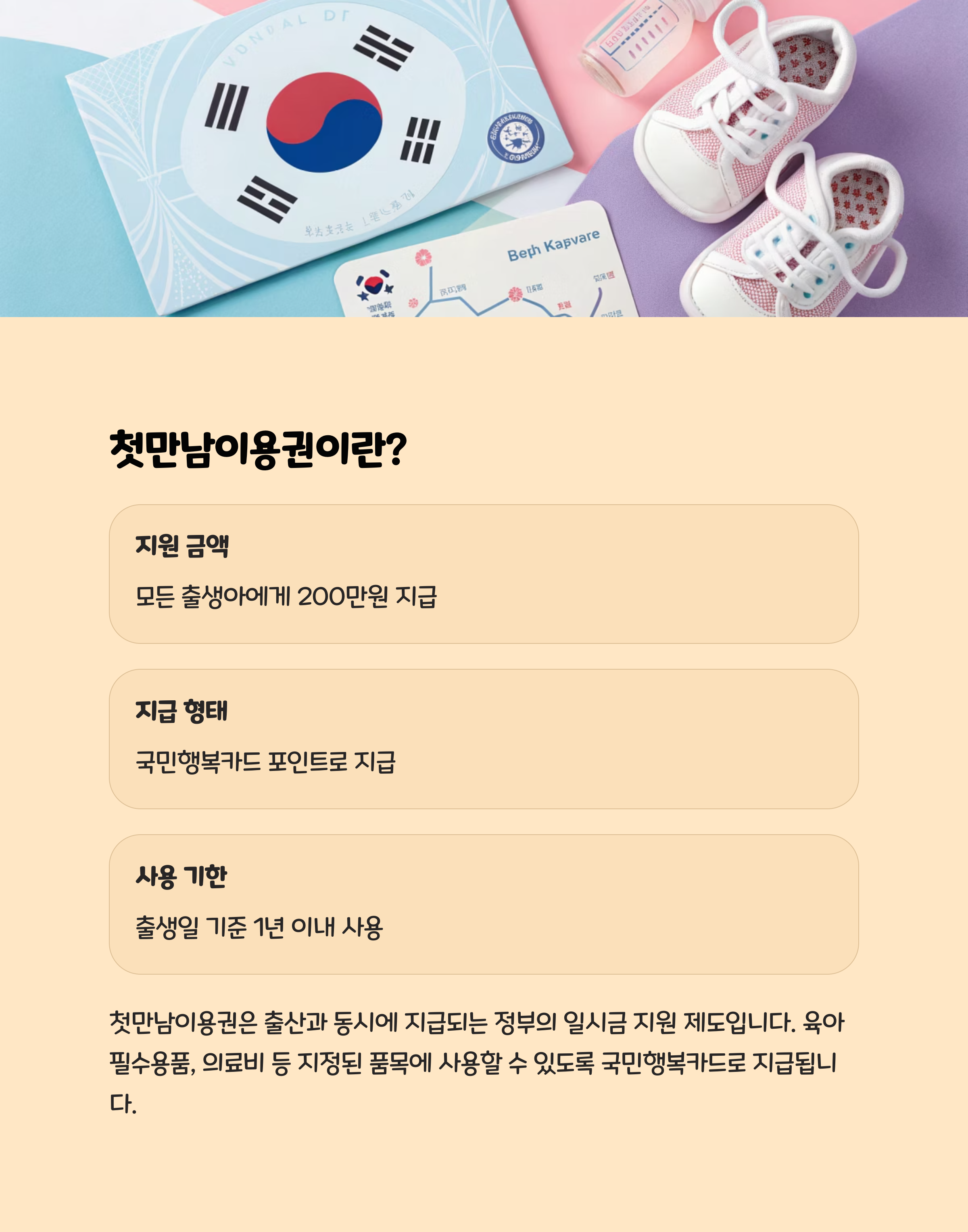 첫만남이용권은 출산과 동시에 지급되는 정부의 일시금 지원 제도로, 모든 출생아에게 200만 원이 지급됩니다. 육아 필수용품, 의료비 등 지정된 품목에 사용할 수 있도록 국민행복카드로 지급됩니다.