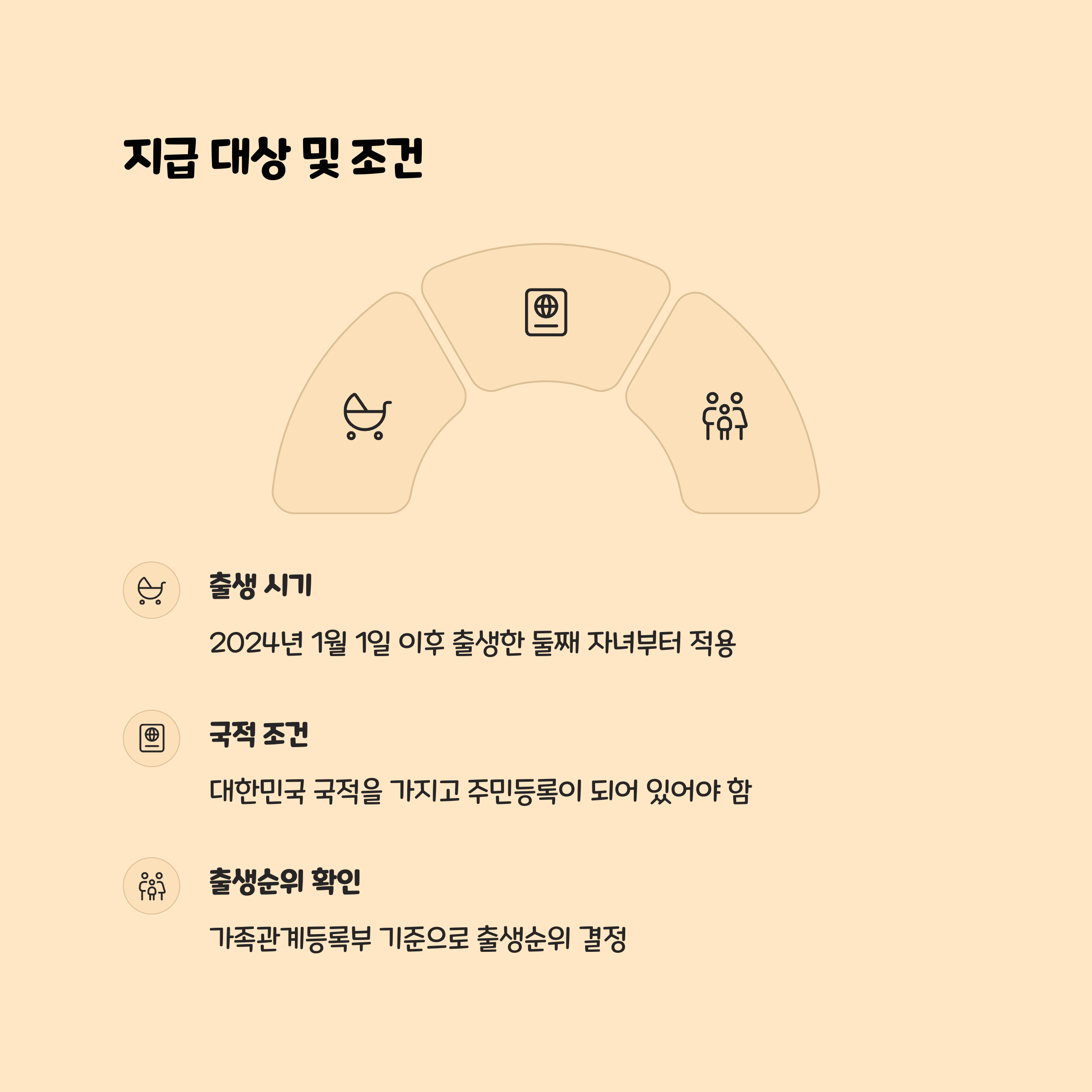 2024년 1월 1일 이후 출생한 둘째 자녀부터 적용됩니다. 대한민국 국적을 가지고 주민등록이 되어 있어야 하며, 출생순위 확인은 가족관계등록부 기준으로 결정됩니다.