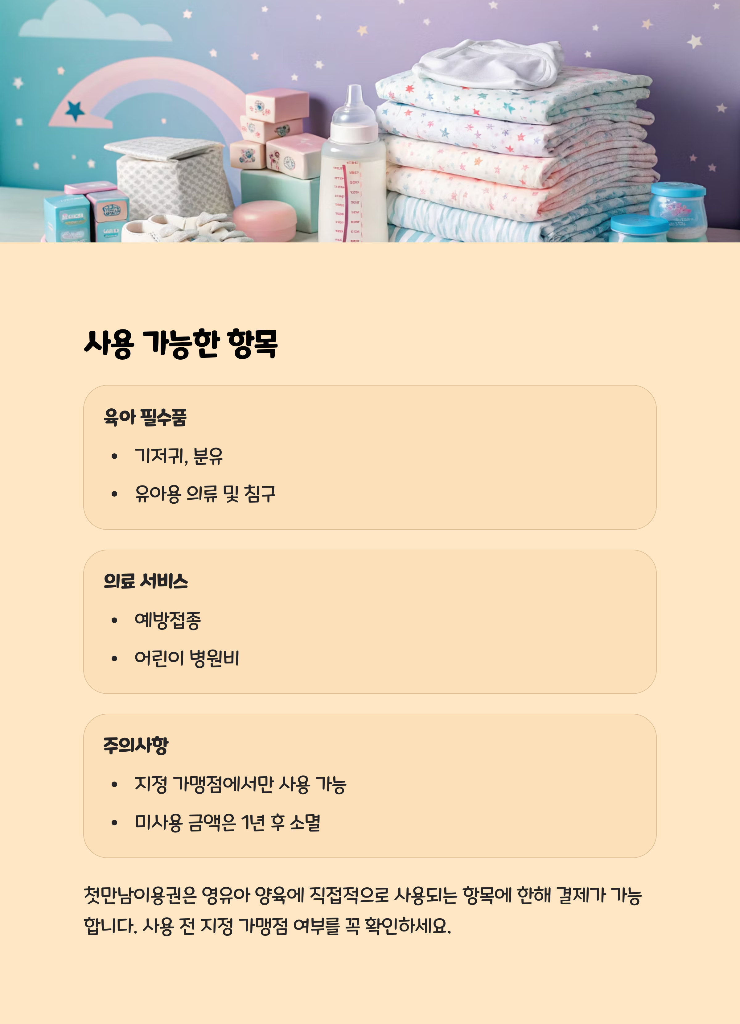 기저귀, 분유, 유아용 의류 및 침구, 예방접종, 어린이 병원비 등 영유아 양육에 직접적으로 사용되는 항목에 한해 결제가 가능합니다. 지정 가맹점에서만 사용이 가능하므로 사전 확인이 필요합니다.