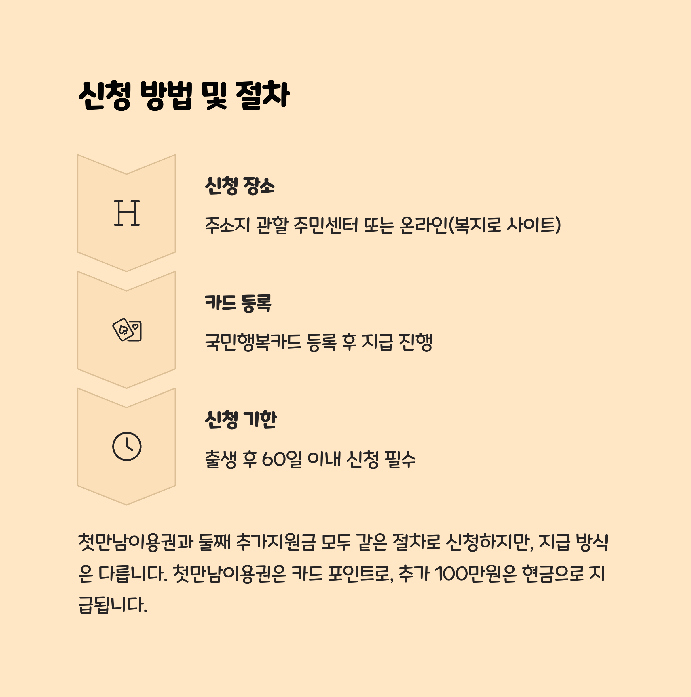 첫만남이용권과 둘째 추가지원금 모두 주소지 관할 주민센터 또는 온라인(복지로 사이트)에서 신청 가능합니다. 국민행복카드 등록 후 지급이 이뤄지며, 신청 기한은 출생 후 60일 이내입니다.