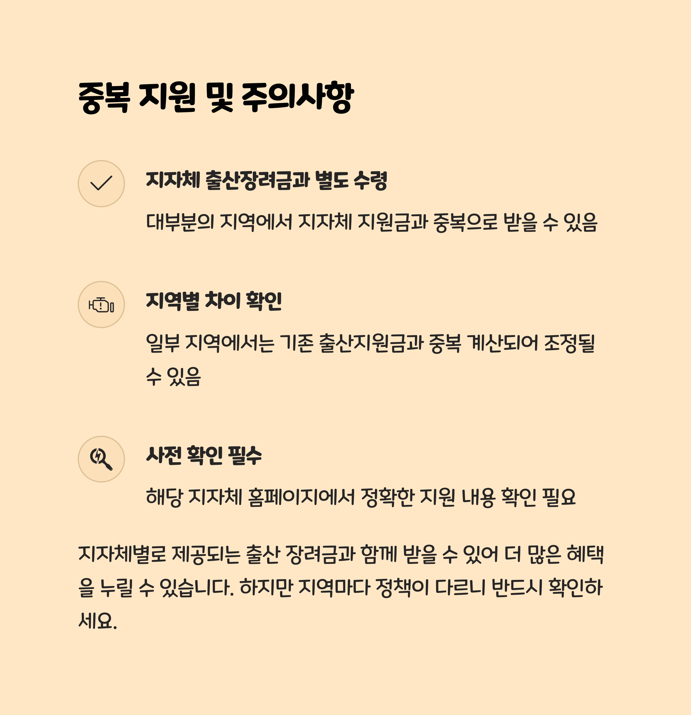 지자체별로 제공되는 출산 장려금과는 별도로 수령 가능합니다. 단, 일부 지역에서는 기존 출산지원금과 중복으로 계산되어 조정될 수 있으니 해당 지자체 홈페이지에서 사전 확인이 필요합니다.