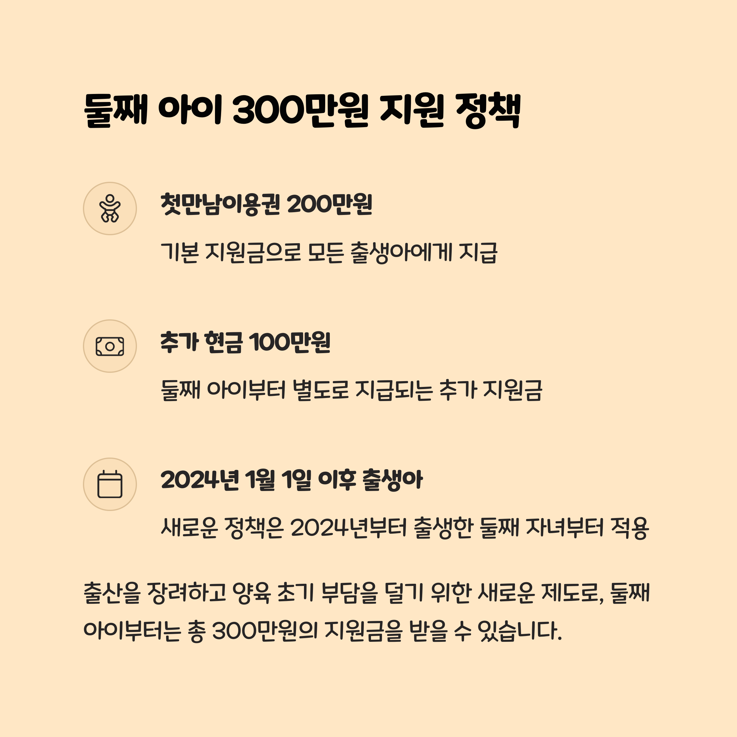 2024년부터 둘째 아이에게는 첫만남이용권(200만 원)에 더해 별도 현금 100만 원이 추가로 지원되어 총 300만 원이 지급됩니다. 출산을 장려하고 양육 초기 부담을 덜기 위한 새로운 제도입니다.