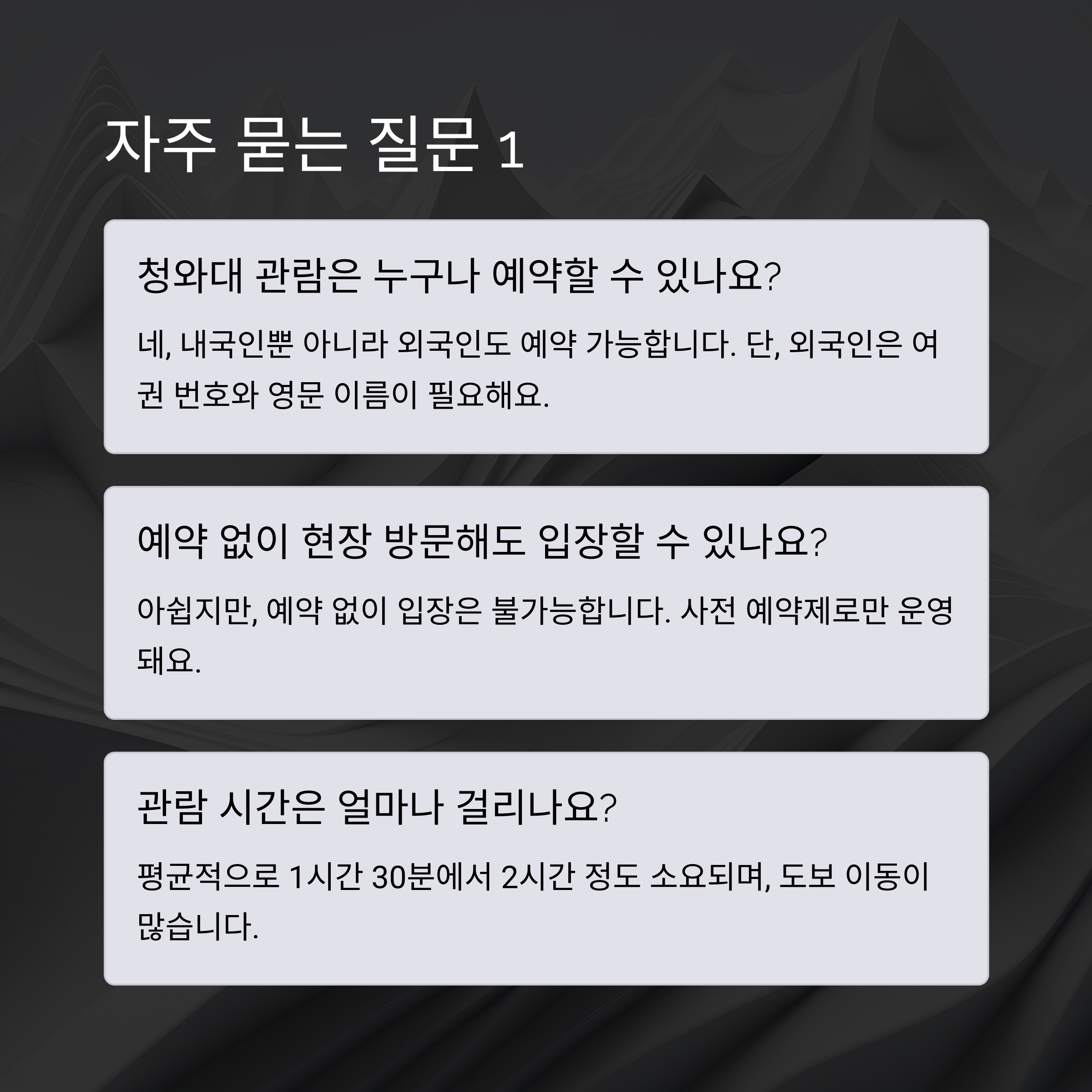 청와대 관람은 단순한 관광 그 이상의 의미가 있어요. 역사와 정치, 그리고 자연이 공존하는 공간을 직접 보고 걸으며 느끼는 감동은 정말 특별하답니다. 혹시 아직 망설이고 계셨다면 이번 기회에 꼭 예약 도전해보세요! 그리고 관람 후에는 근처에서 느긋한 산책도 즐겨보시구요. 다음에 더 재미있는 정보로 또 만나요 :)
