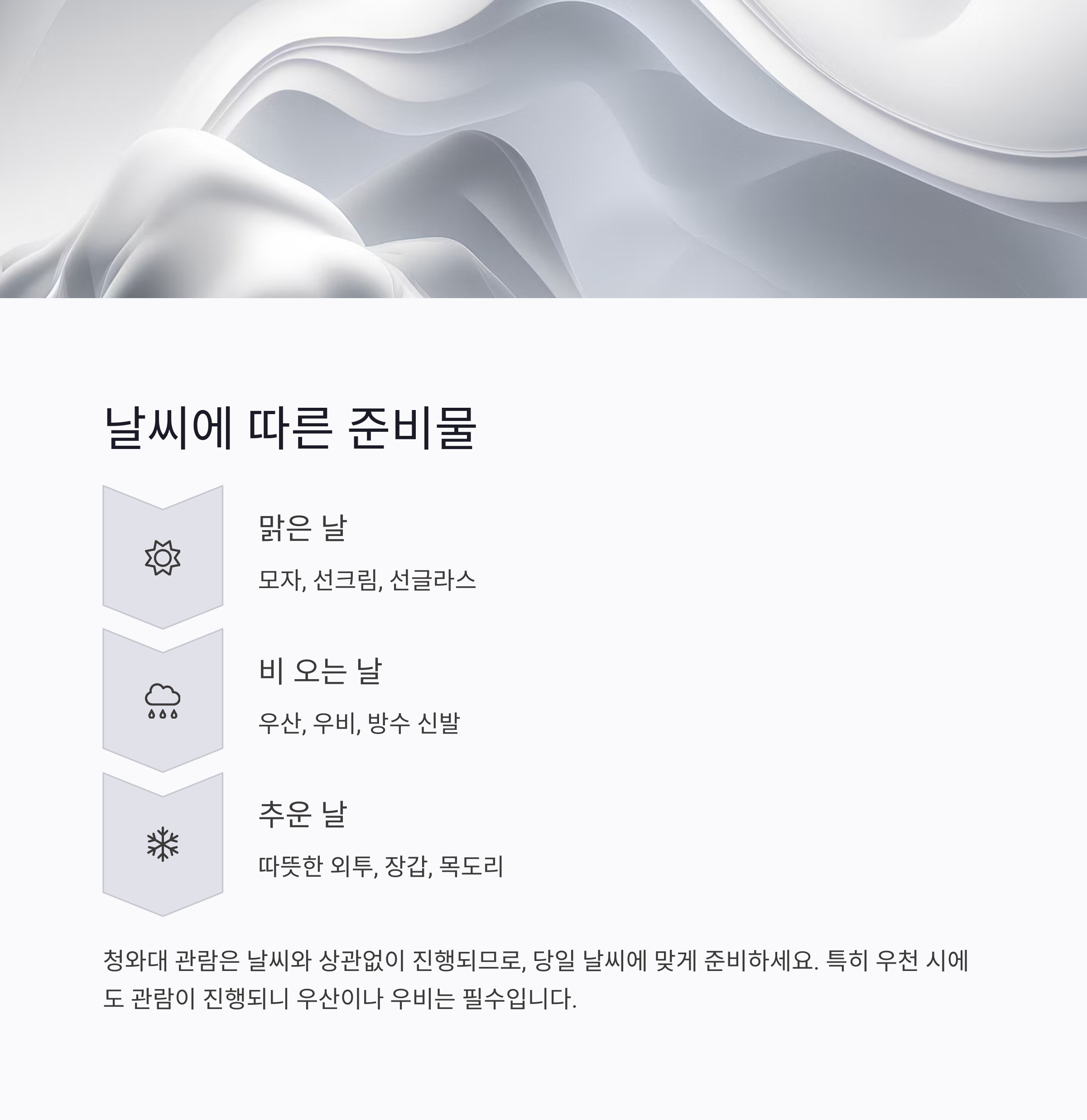 비가 와도 관람은 진행되지만, 우산 또는 우비는 필수로 준비하셔야 해요.