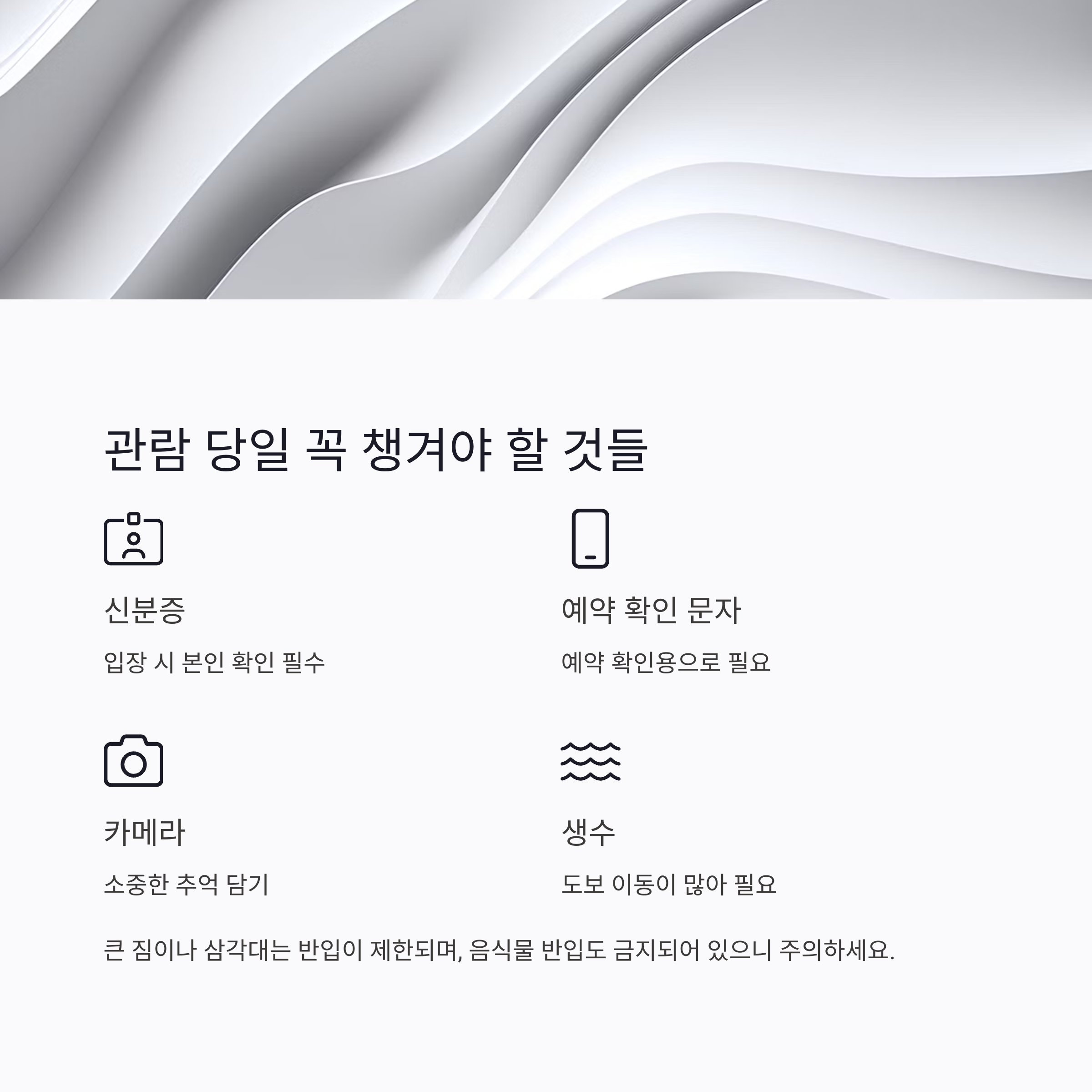 예약 성공했다고 안심하긴 이릅니다! 현장에 가기 전에 꼭 알아야 할 몇 가지 유의사항이 있어요. 먼저 신분증 지참은 필수입니다. 입장 시 본인 확인 절차가 진행되기 때문에 주민등록증, 운전면허증 등을 꼭 챙기세요. 또 입장 시간에 맞춰 도착하는 것도 중요해요. 지정된 시간보다 10분 전에 도착하시는 걸 추천드려요. 음식물 반입은 금지이며, 큰 짐이나 삼각대도 제한됩니다.