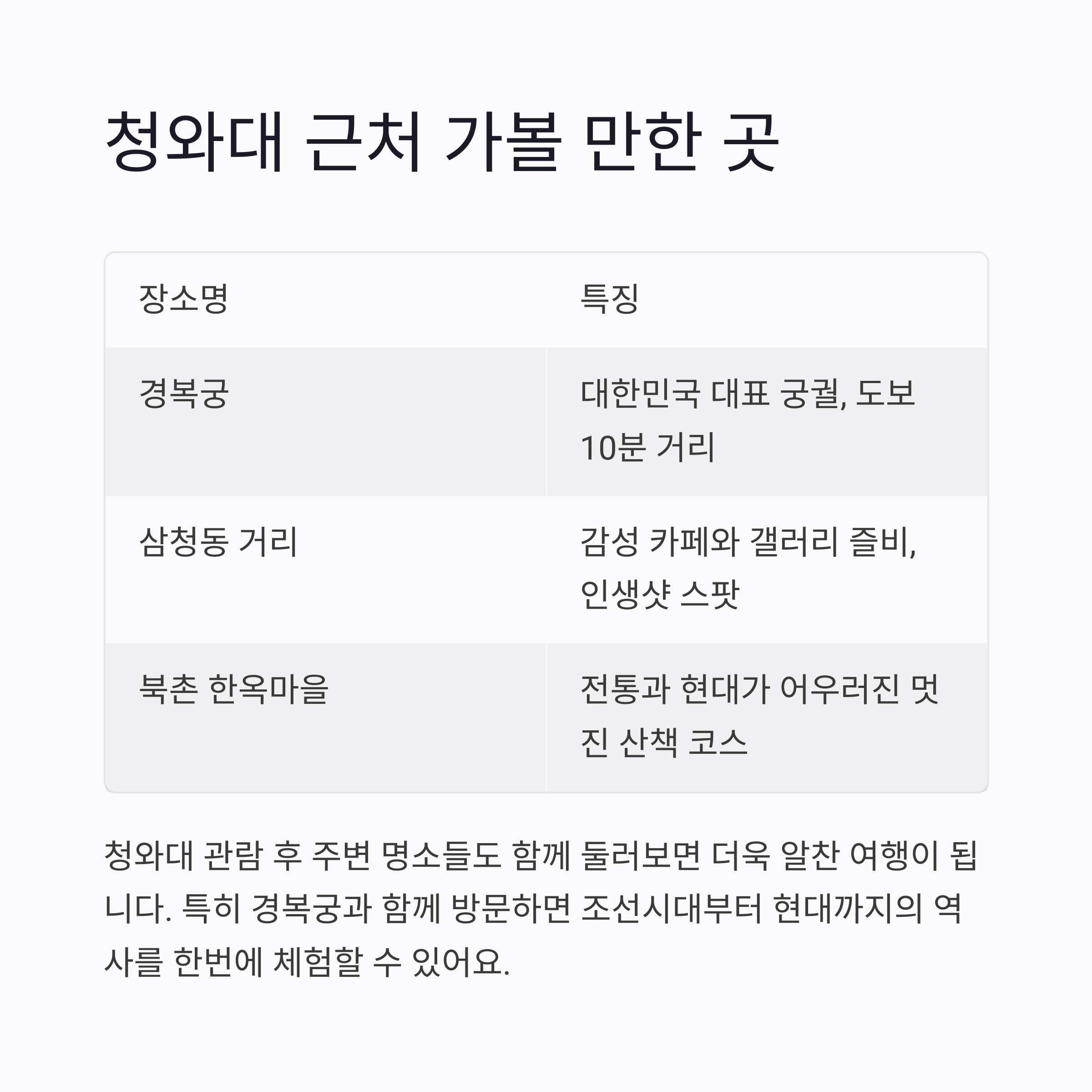 | 경복궁 | 대한민국 대표 궁궐, 도보 10분 거리 |