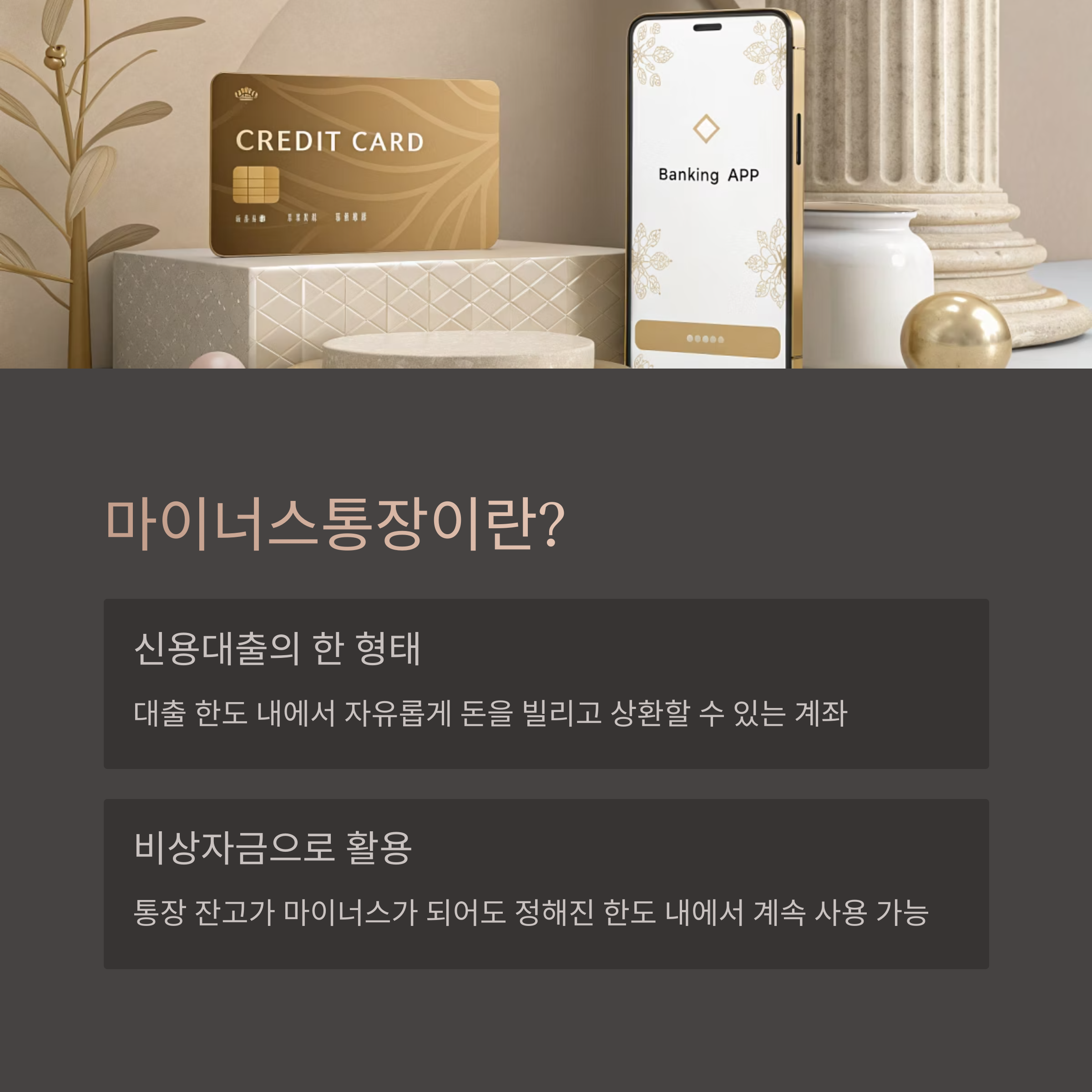 마이너스통장은 신용대출의 한 형태로, 대출 한도 내에서 자유롭게 돈을 빌리고 상환할 수 있는 계좌입니다.