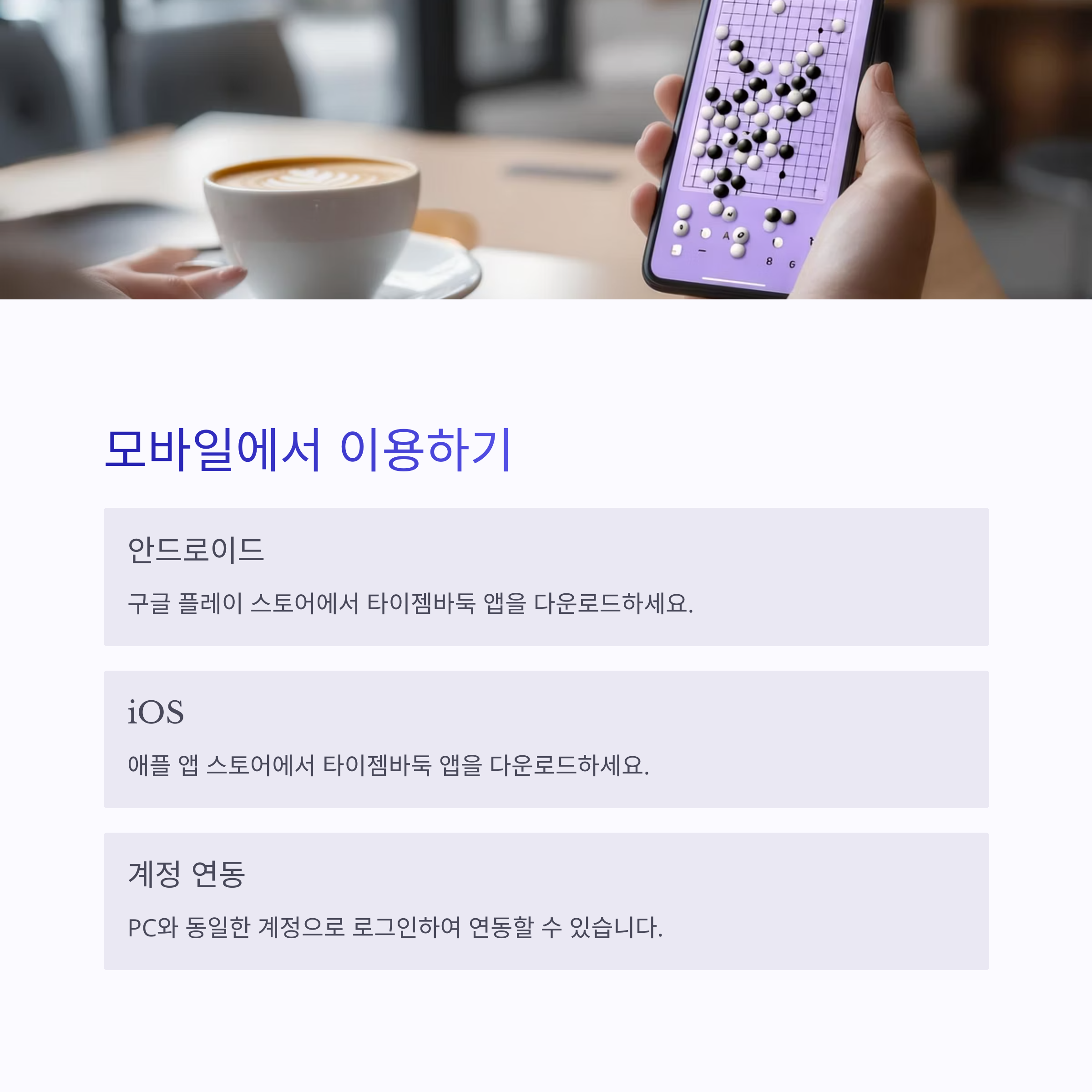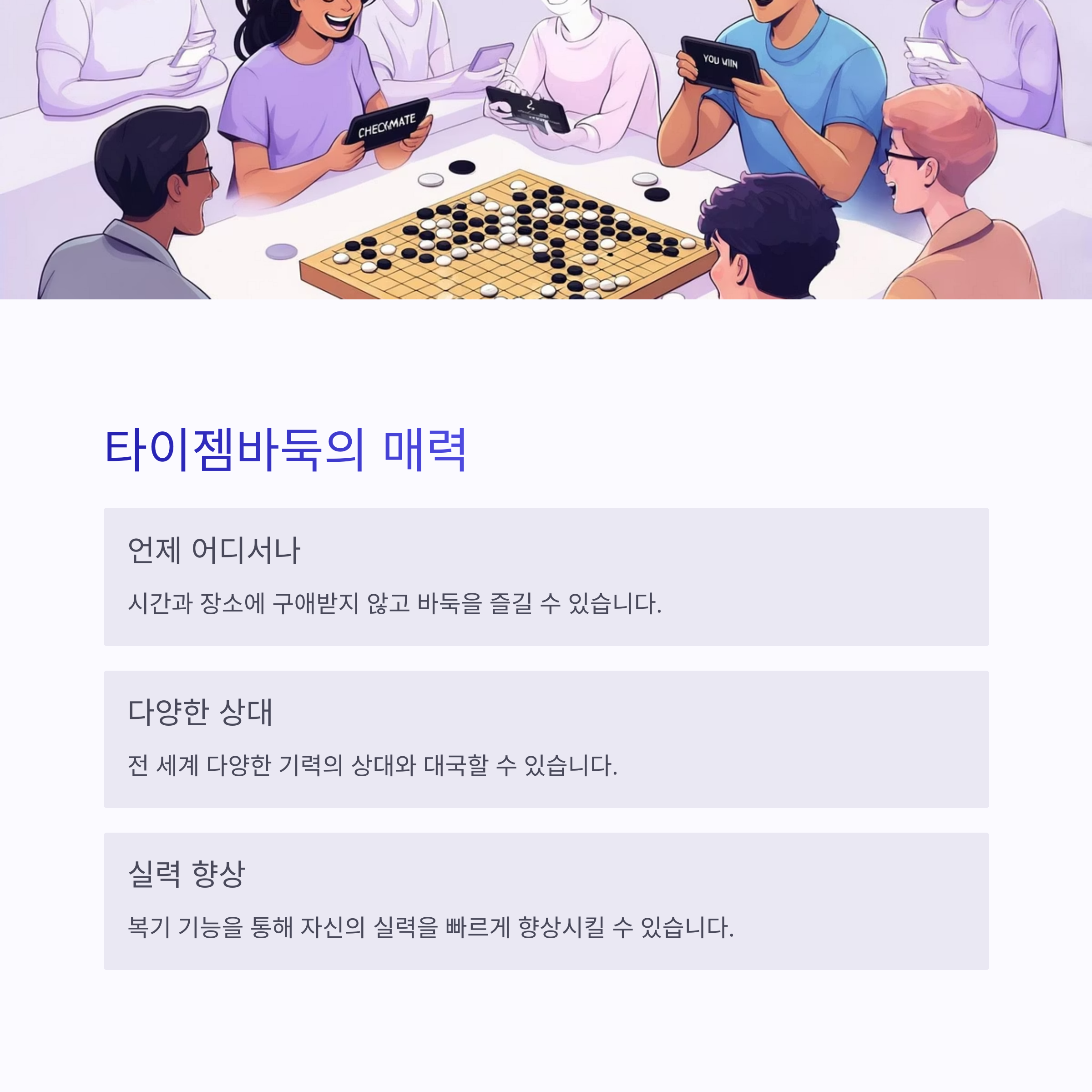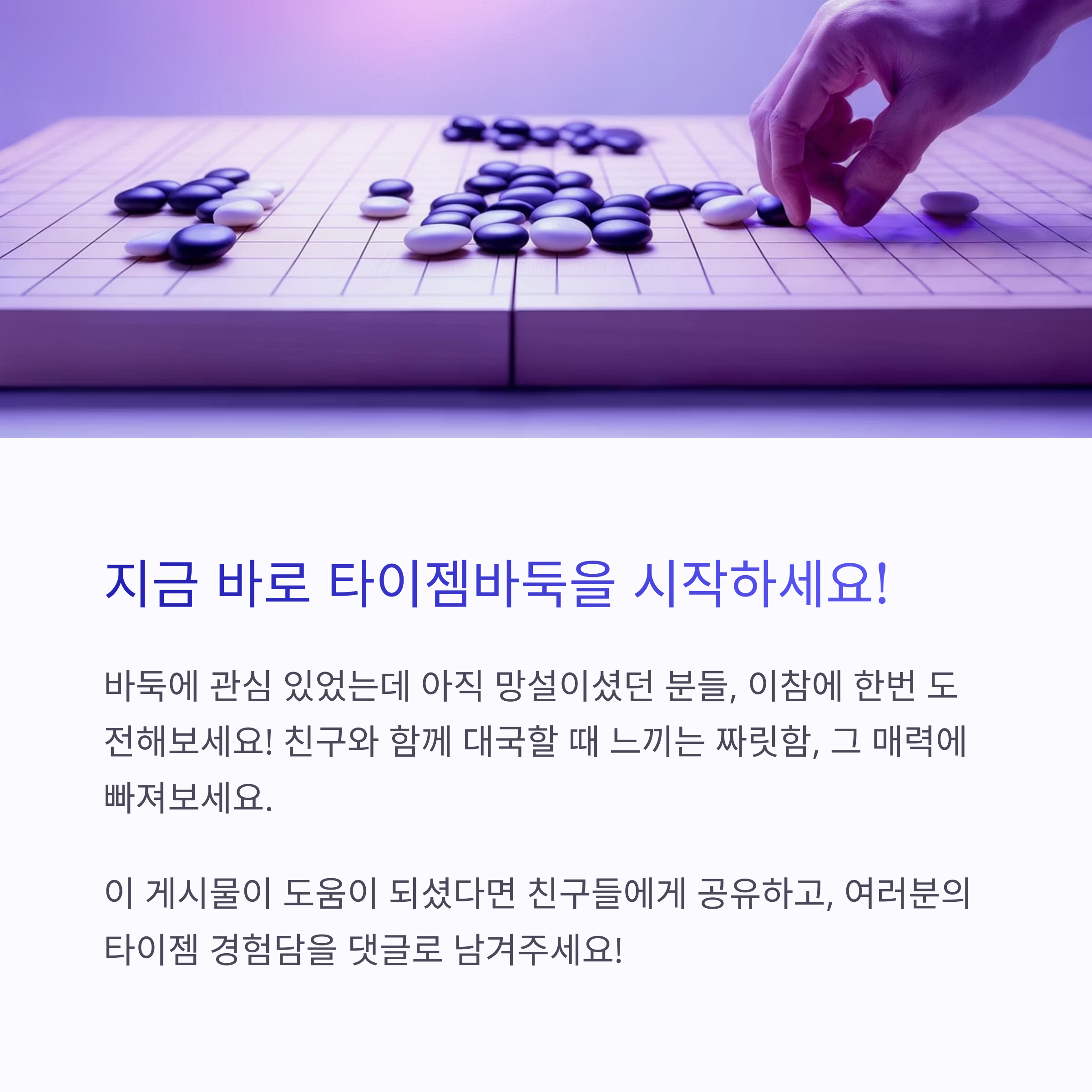 안녕하세요, 여러분! 요즘 저녁마다 타이젬에서 바둑 두는 재미에 푹 빠져 사는 사람입니다. 저는 원래는 동네 바둑 동호회에서 아마추어로 가끔 두곤 했는데요, 친구의 추천으로 타이젬바둑을 설치해봤다가 그만... 중독돼 버렸어요. 대국 상대도 많고, 실시간으로 바로 대국실에 들어가 상대를 만날 수 있는 시스템이 너무 매력적이더라고요. 그래서 오늘은 여러분도 저처럼 타이젬의 매력에 빠져보시라고, 설치부터 대국실 입장까지 하나하나 친절하게 알려드리려고 합니다.