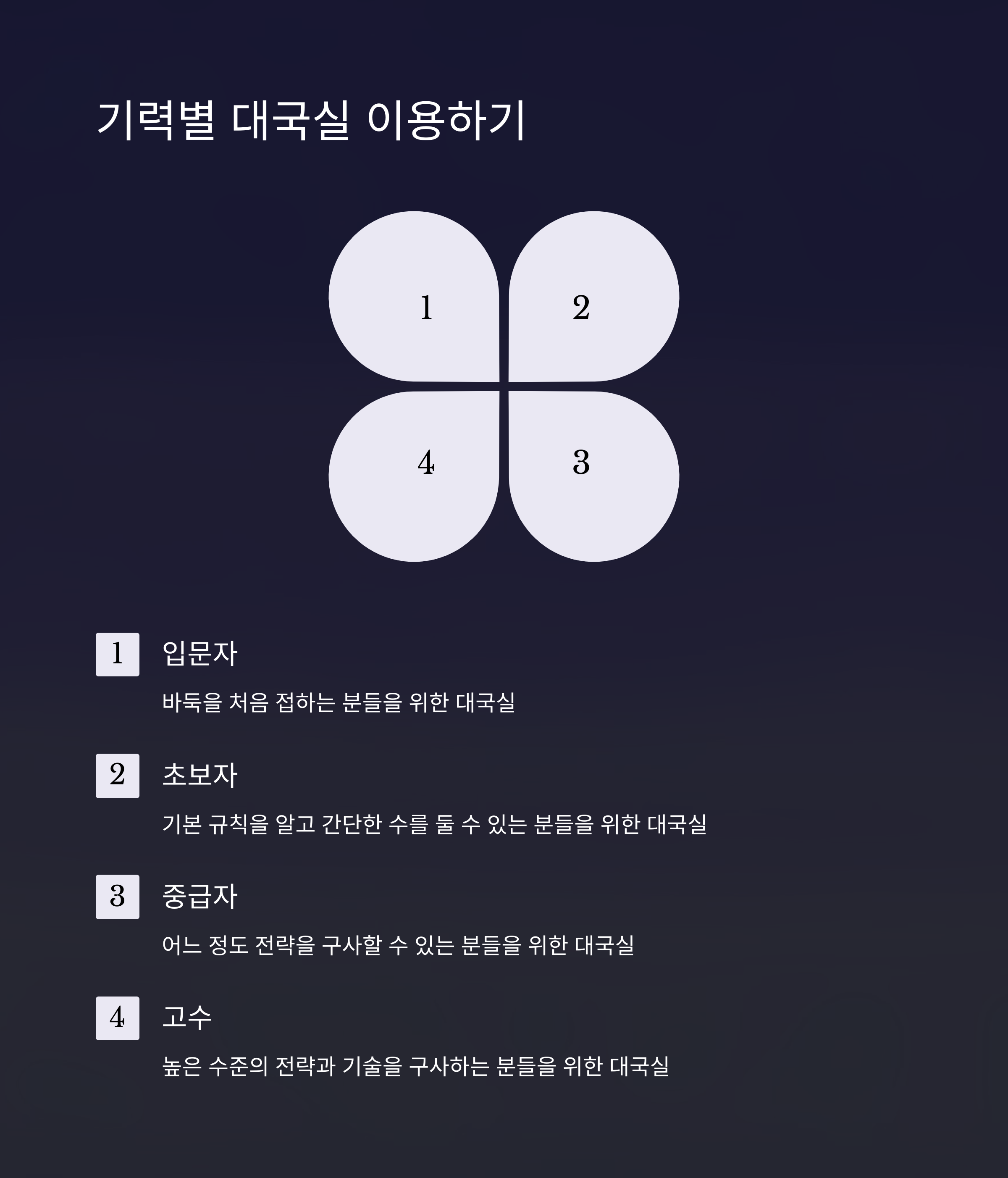 초보자부터 고수까지 모두 이용할 수 있습니다. 대국실이 기력별로 나눠져 있어 실력에 맞는 상대를 쉽게 찾을 수 있어요.