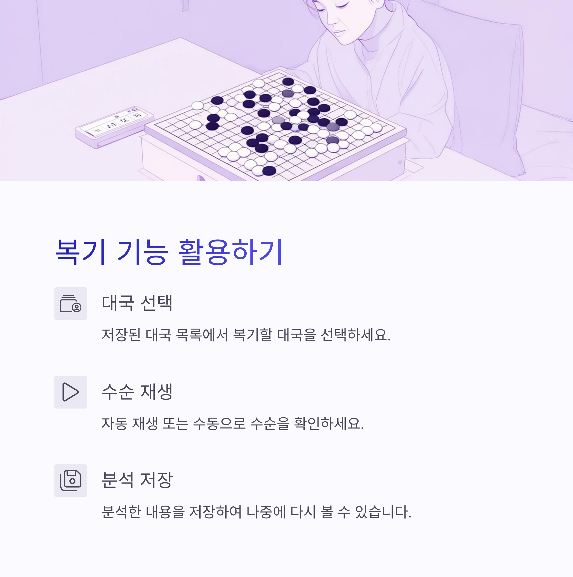 | 자동 저장 | 대국 후 자동으로 복기 저장 |