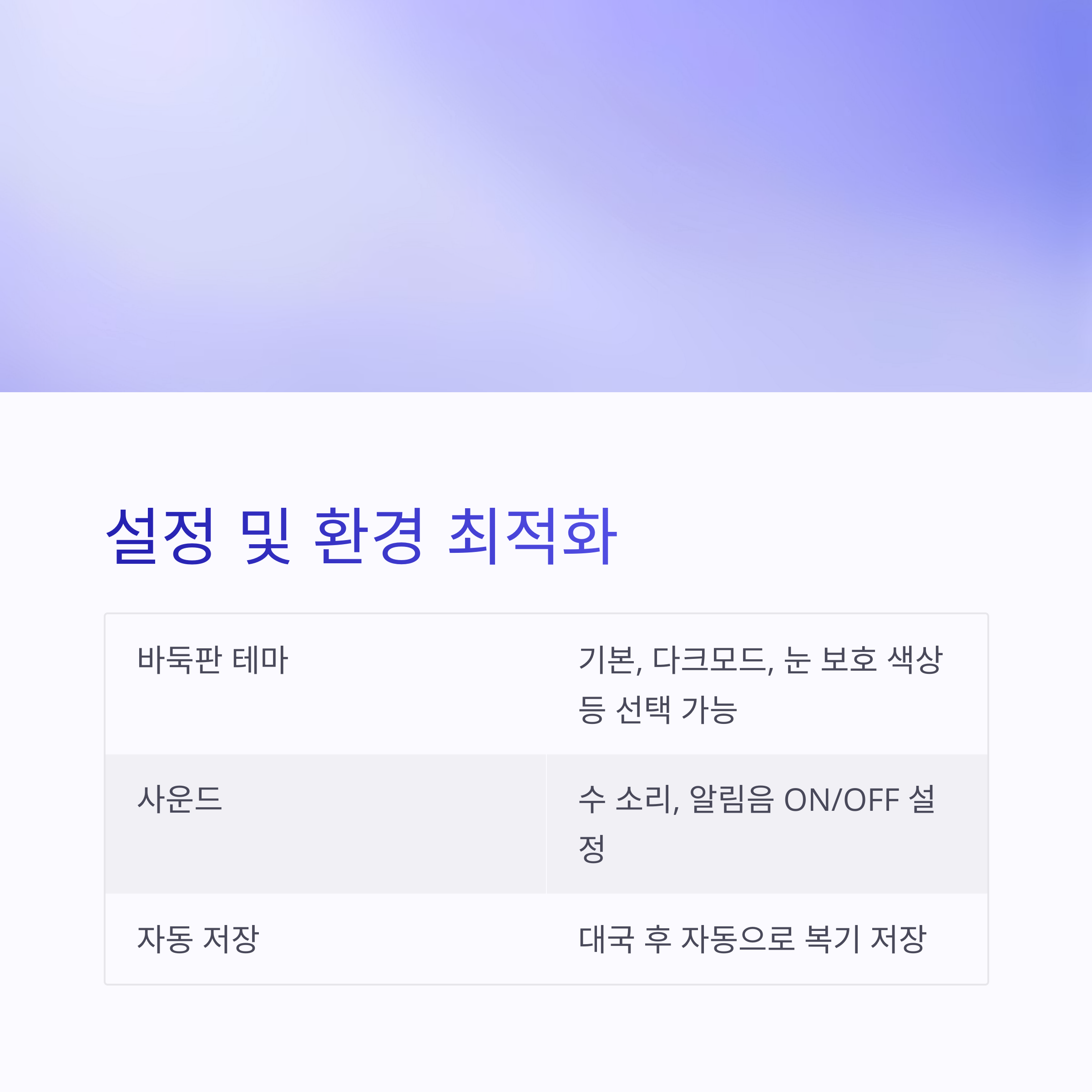 | 사운드 | 수 소리, 알림음 ON/OFF 설정 |