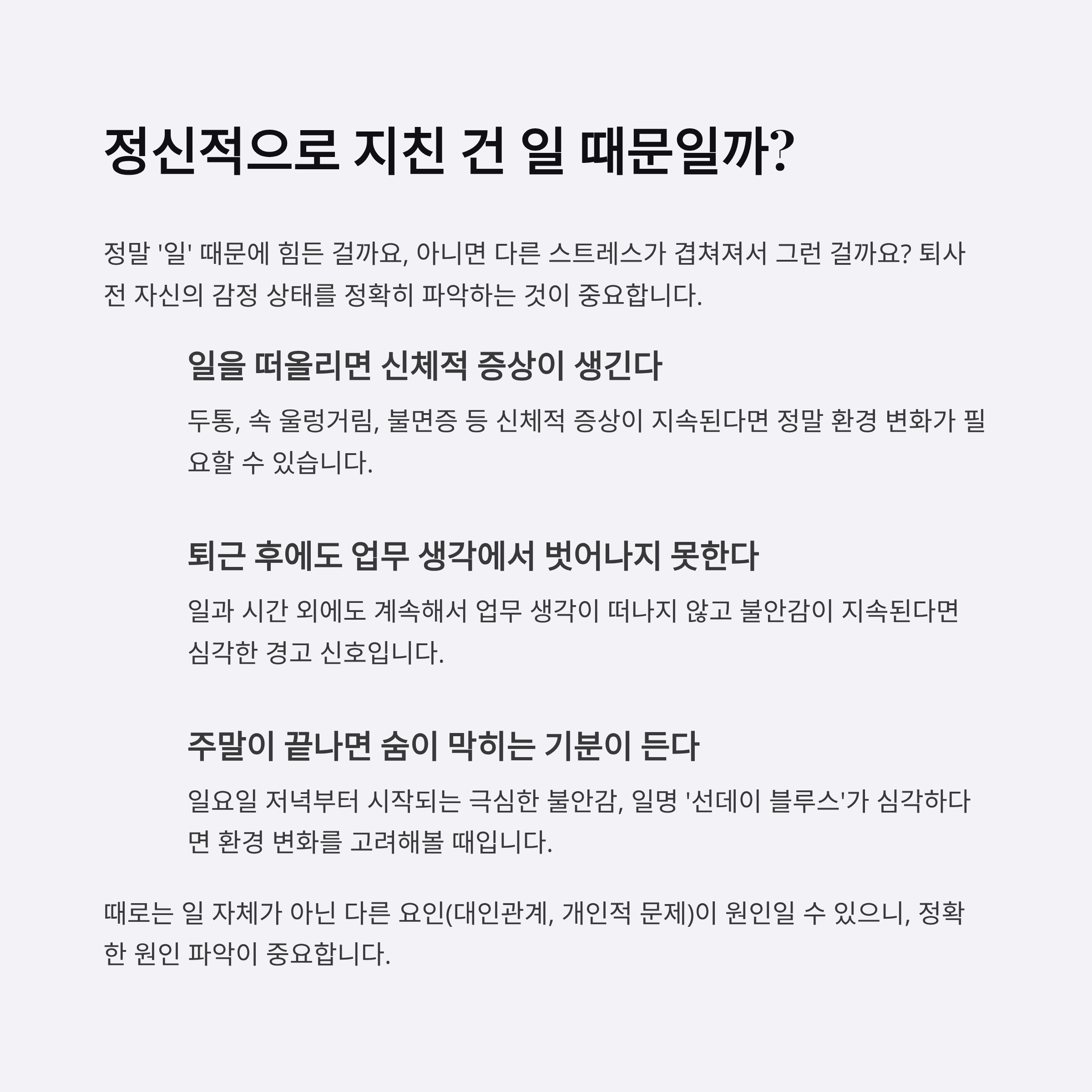 정말 '일' 때문에 힘든 걸까요, 아니면 다른 스트레스가 겹쳐져서 그런 걸까요? 퇴사 전 꼭 자문해보세요. 오히려 일이 내 삶을 붙잡아주는 유일한 루틴일 수도 있어요. 감정적인 결정은 후회로 돌아오기 쉬우니까요. 아래 체크리스트로 내 감정 상태를 점검해보세요.