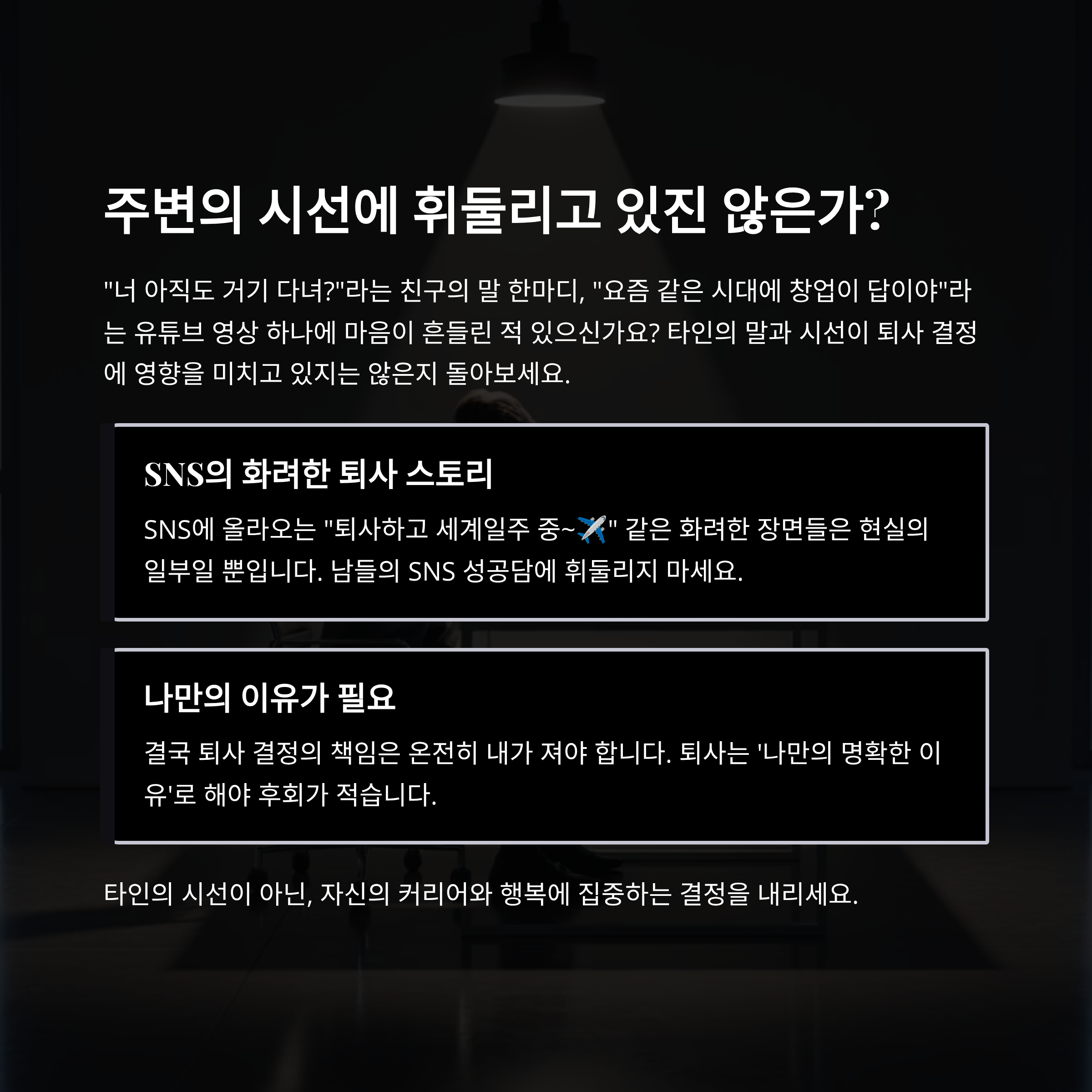 "너 아직도 거기 다녀?"라는 친구의 말 한마디, "요즘 같은 시대에 창업이 답이야"라는 유튜브 영상 하나에 마음이 흔들린 적 있으신가요? 의외로 많은 사람들이 타인의 말과 시선에 영향을 받아 퇴사를 결심하곤 합니다. 하지만 결국 그 결정의 책임은 내가 져야 하잖아요. 퇴사는 '나만의 이유'로 해야 해요. 남들이 뭐라 하든, 내가 정말 원하는 삶인지 자문해보세요.